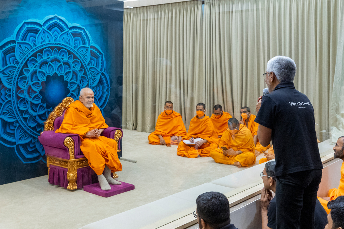 A volunteer presents before Swamishri