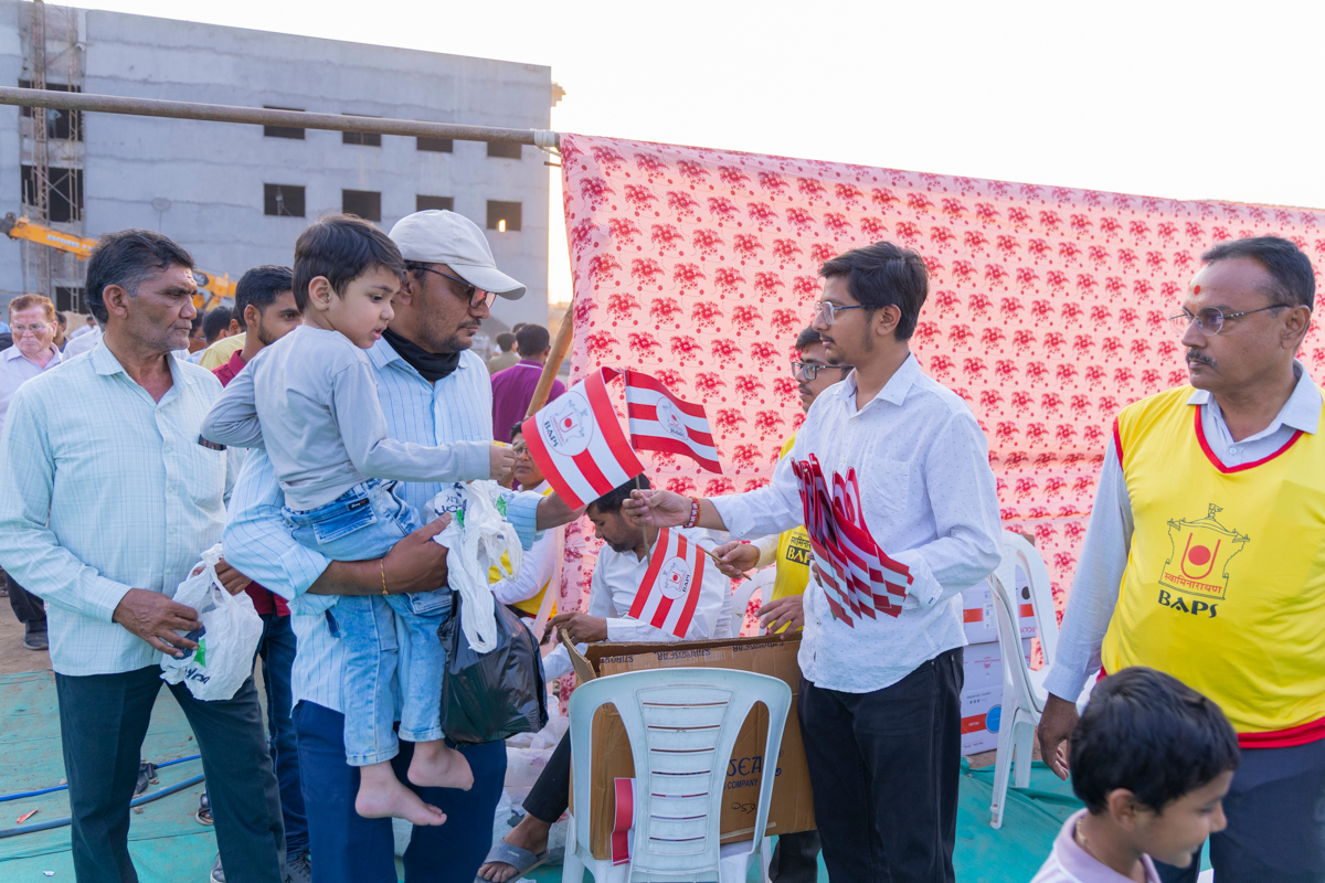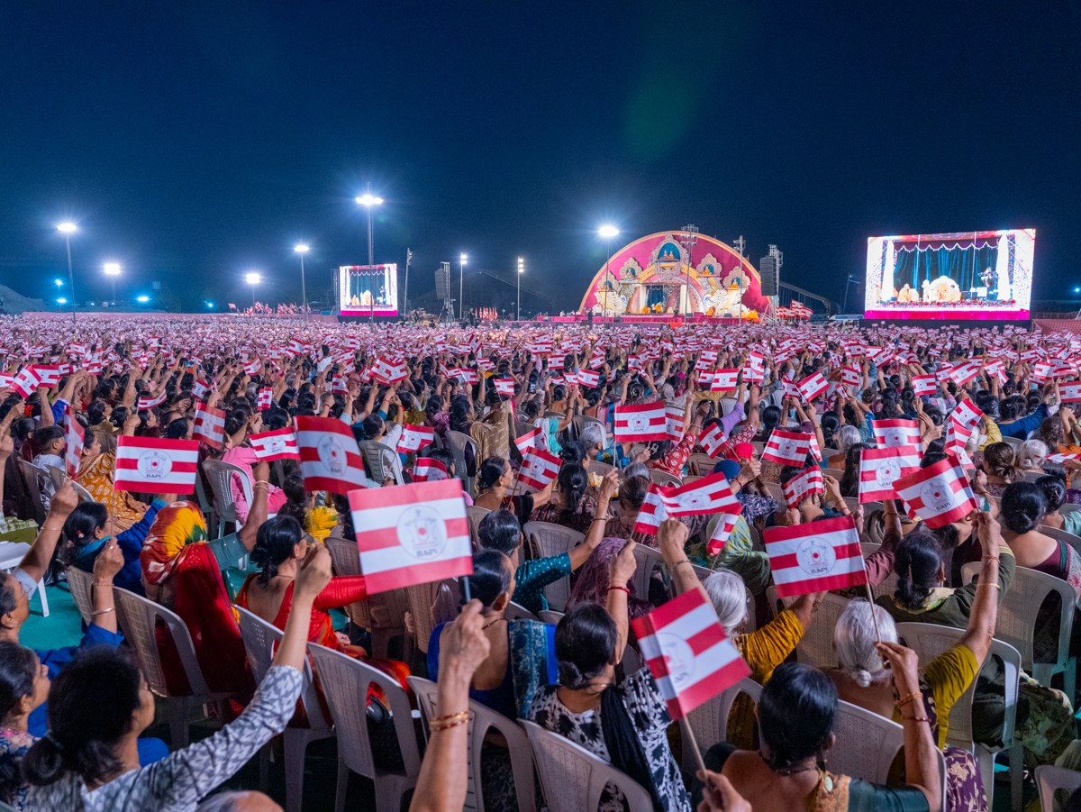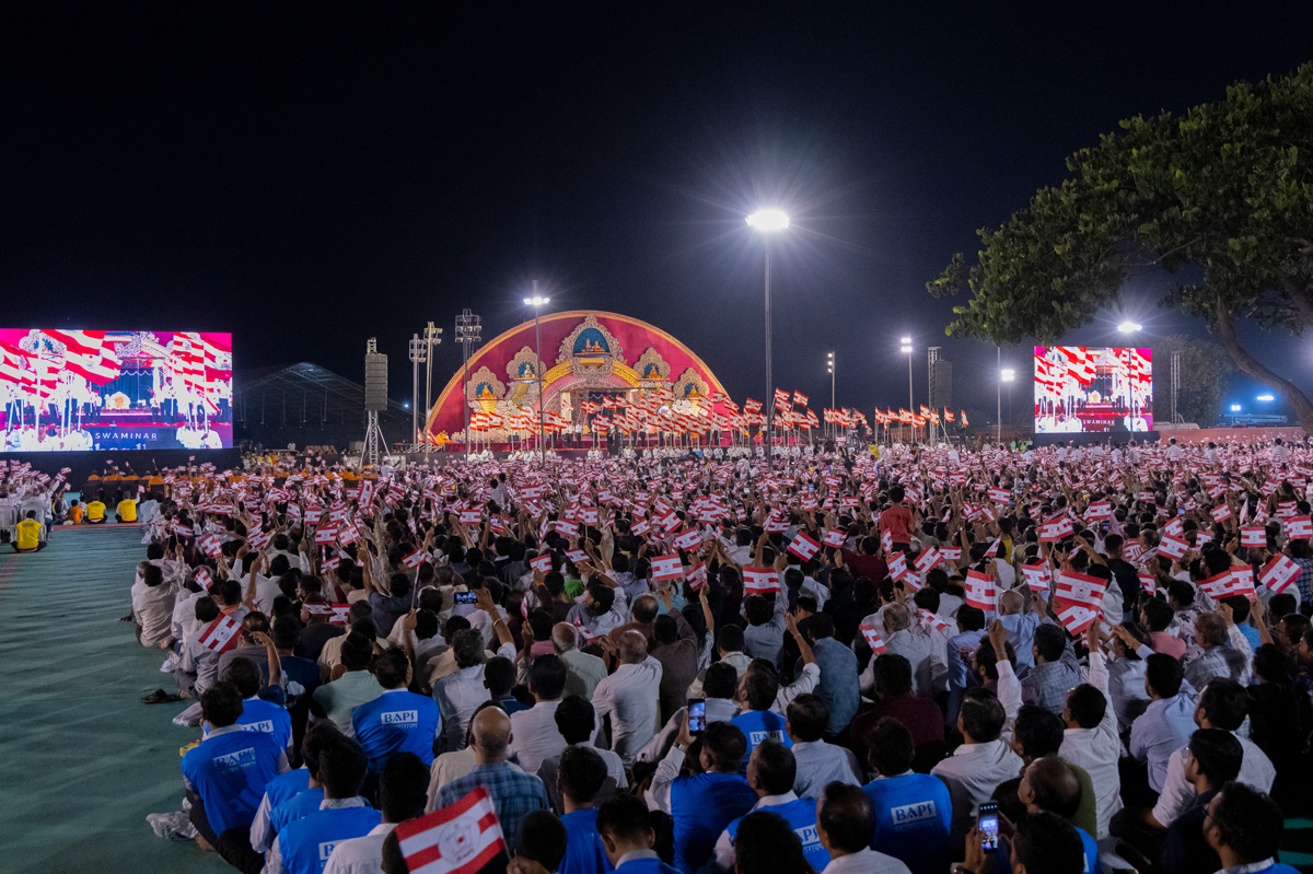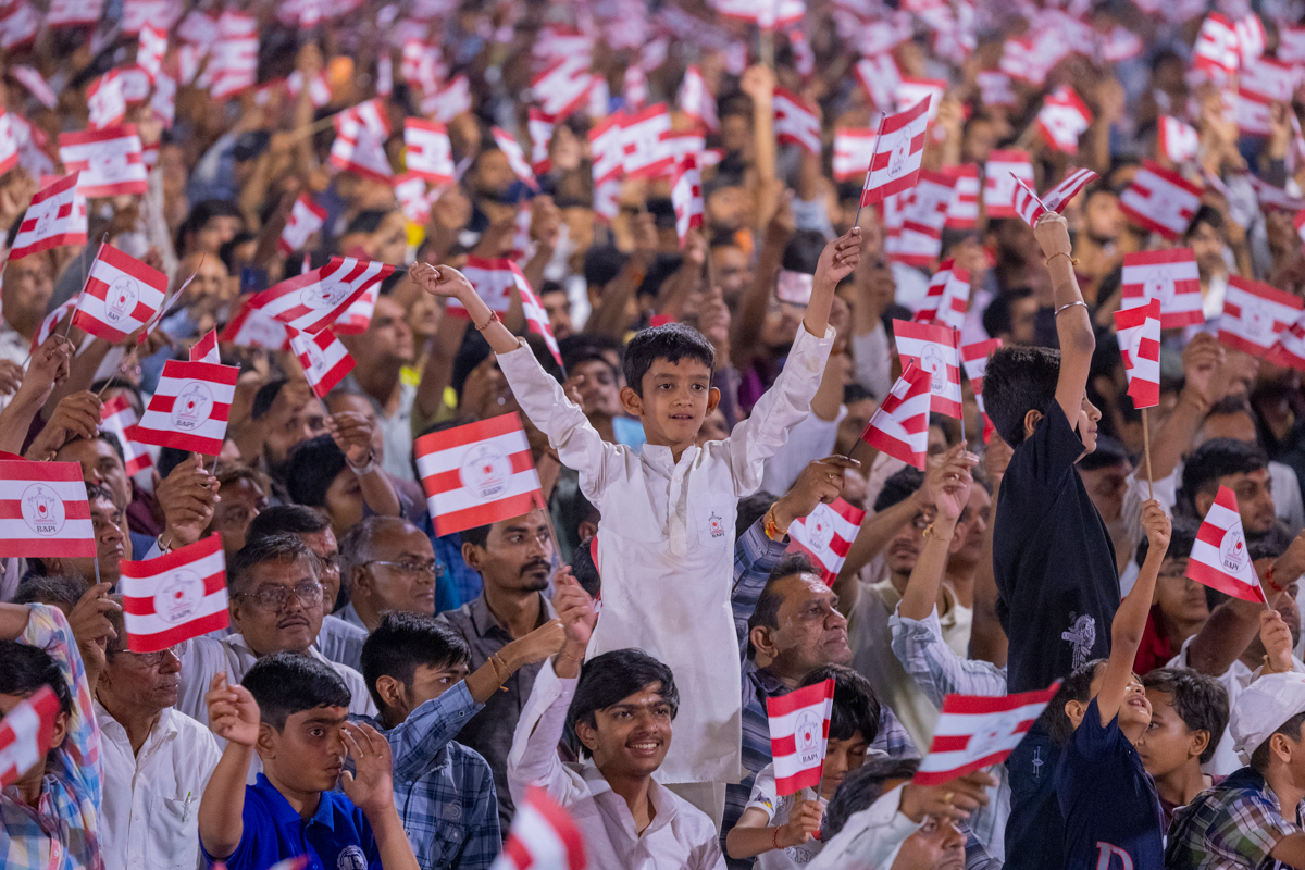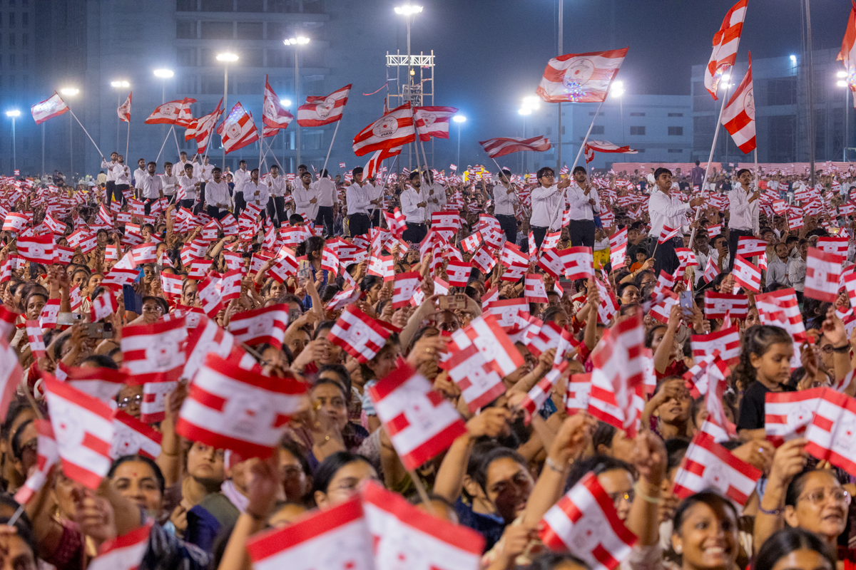 Devotees wave BAPS flags