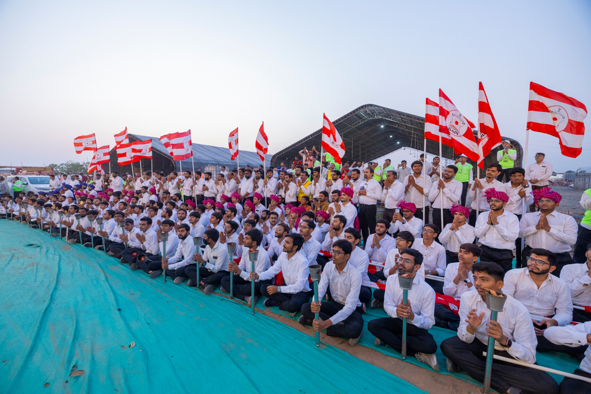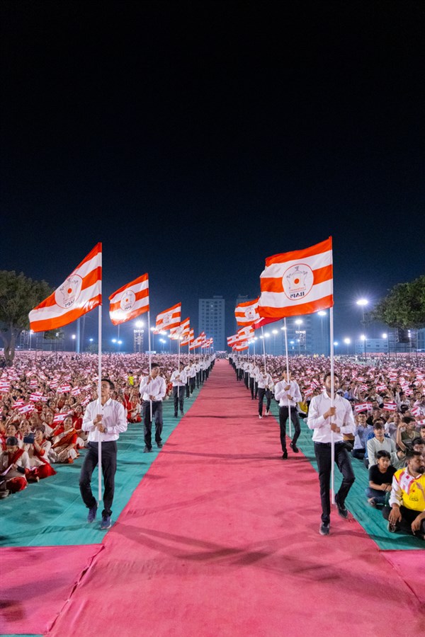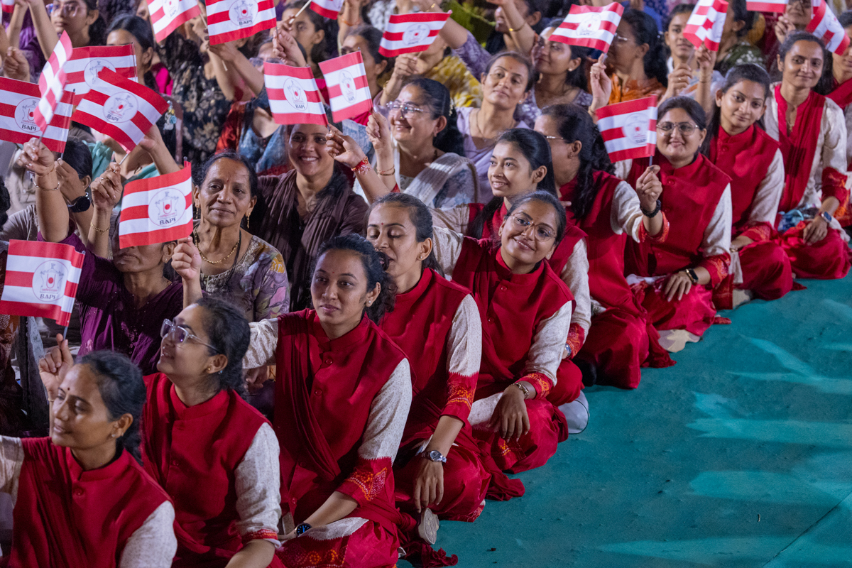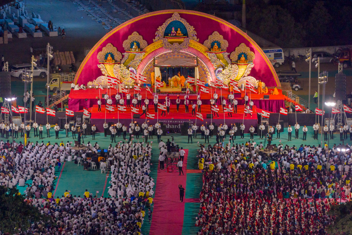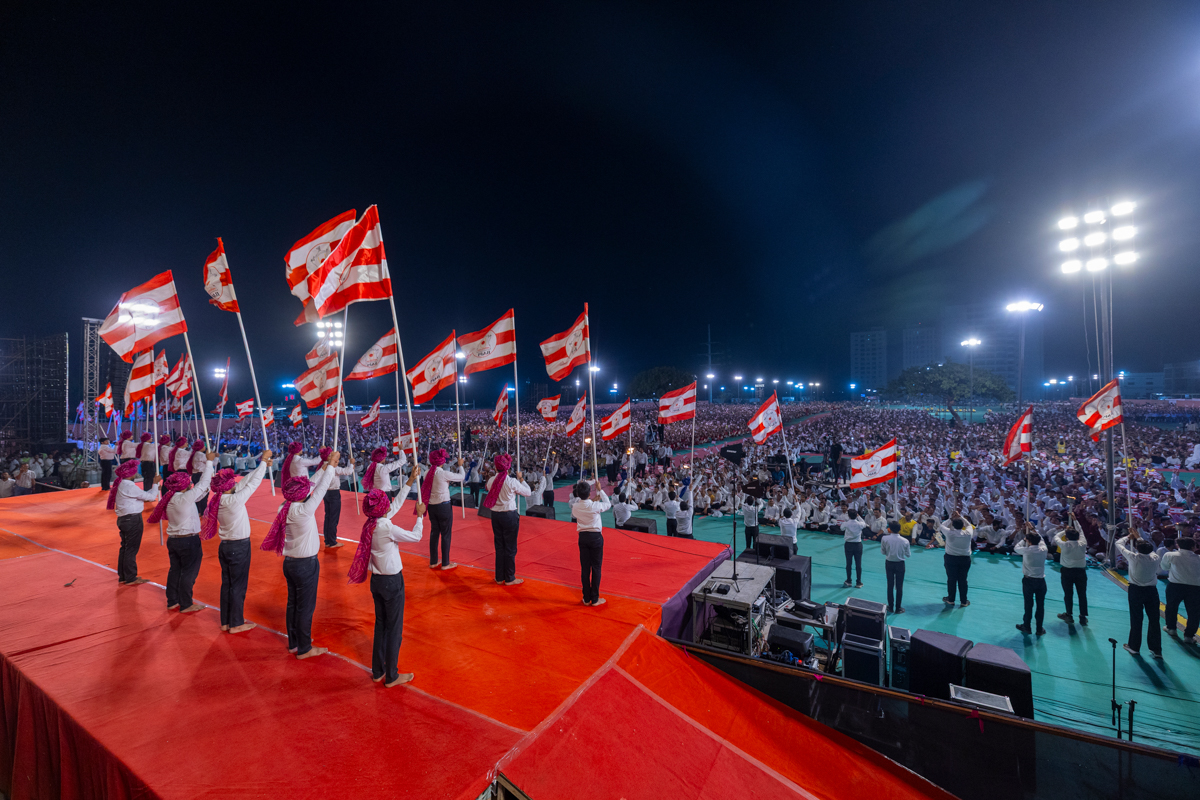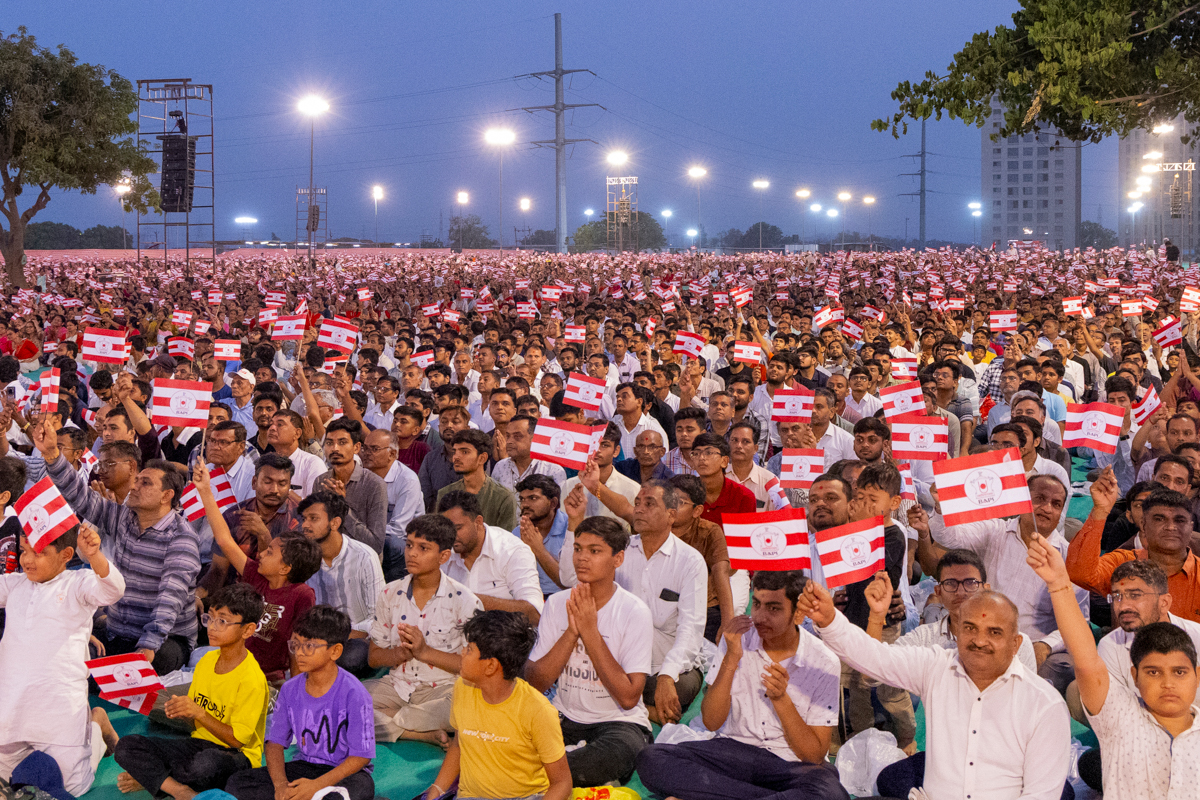 Devotees wave BAPS flags