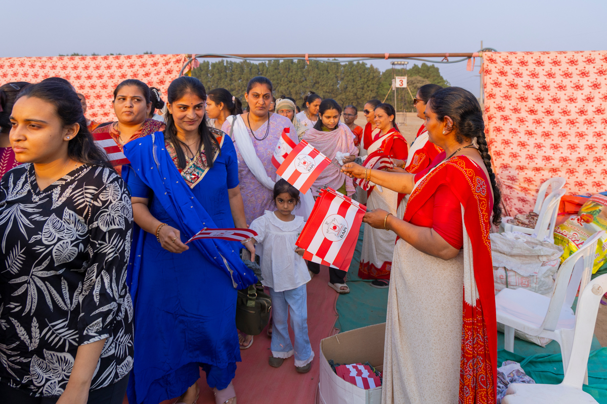 Devotees welcome Swamishri by waving BAPS flags