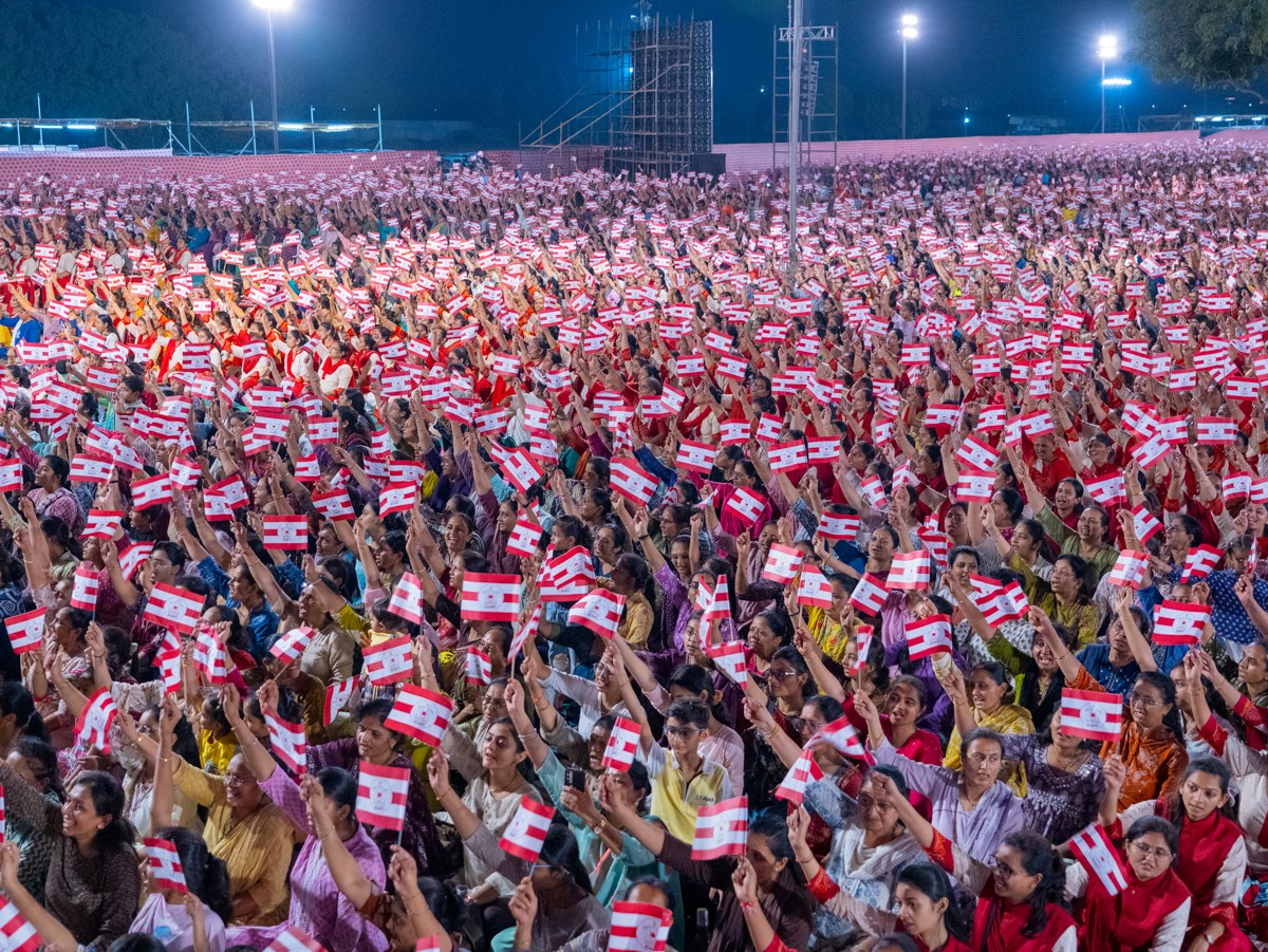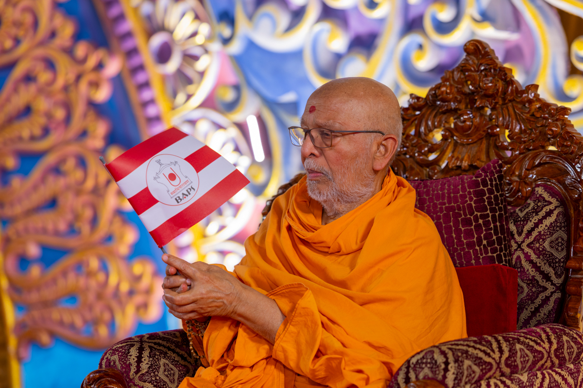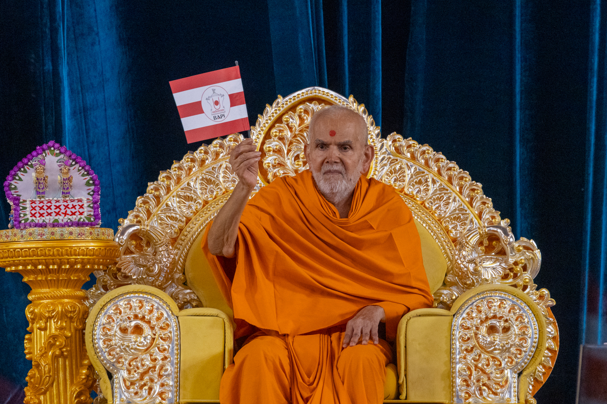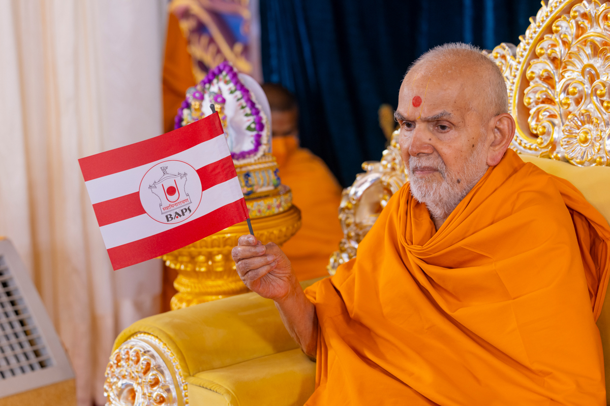 Swamishri waves a BAPS flag