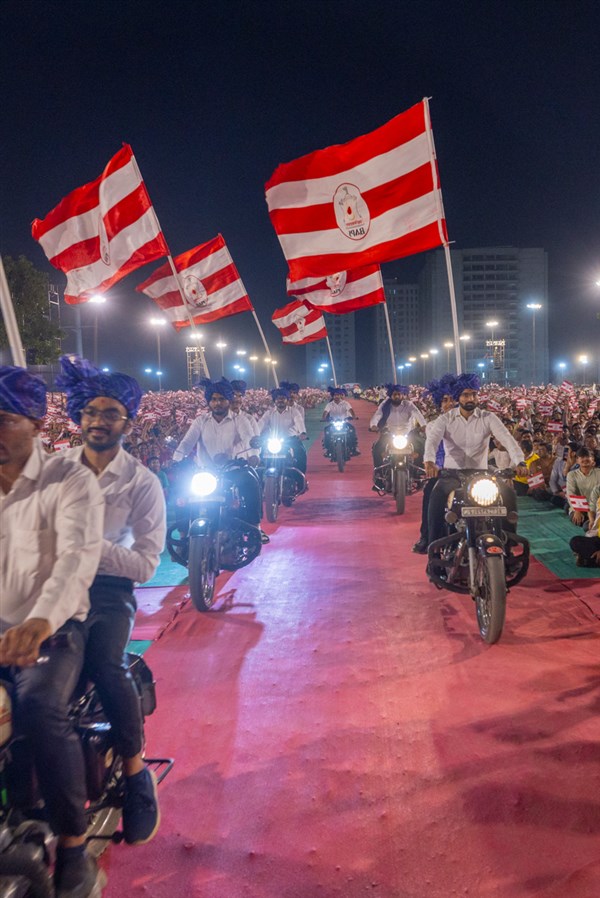 Motorbike parade with BAPS flags