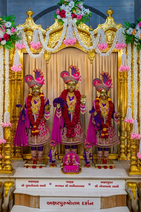 Swamishri engrossed in darshan of Bhagwan Swaminarayan, Aksharbrahma Gunatitanand Swami and Shri Gopalanand Swami