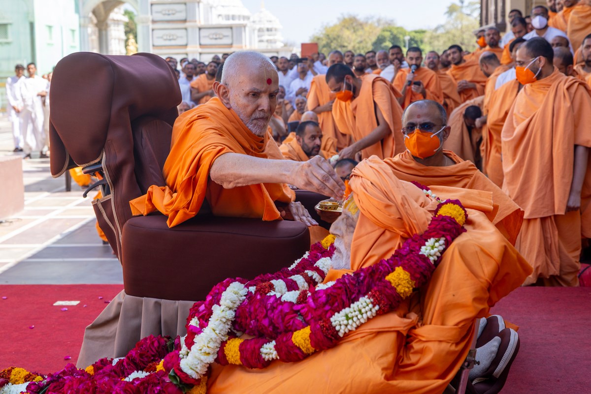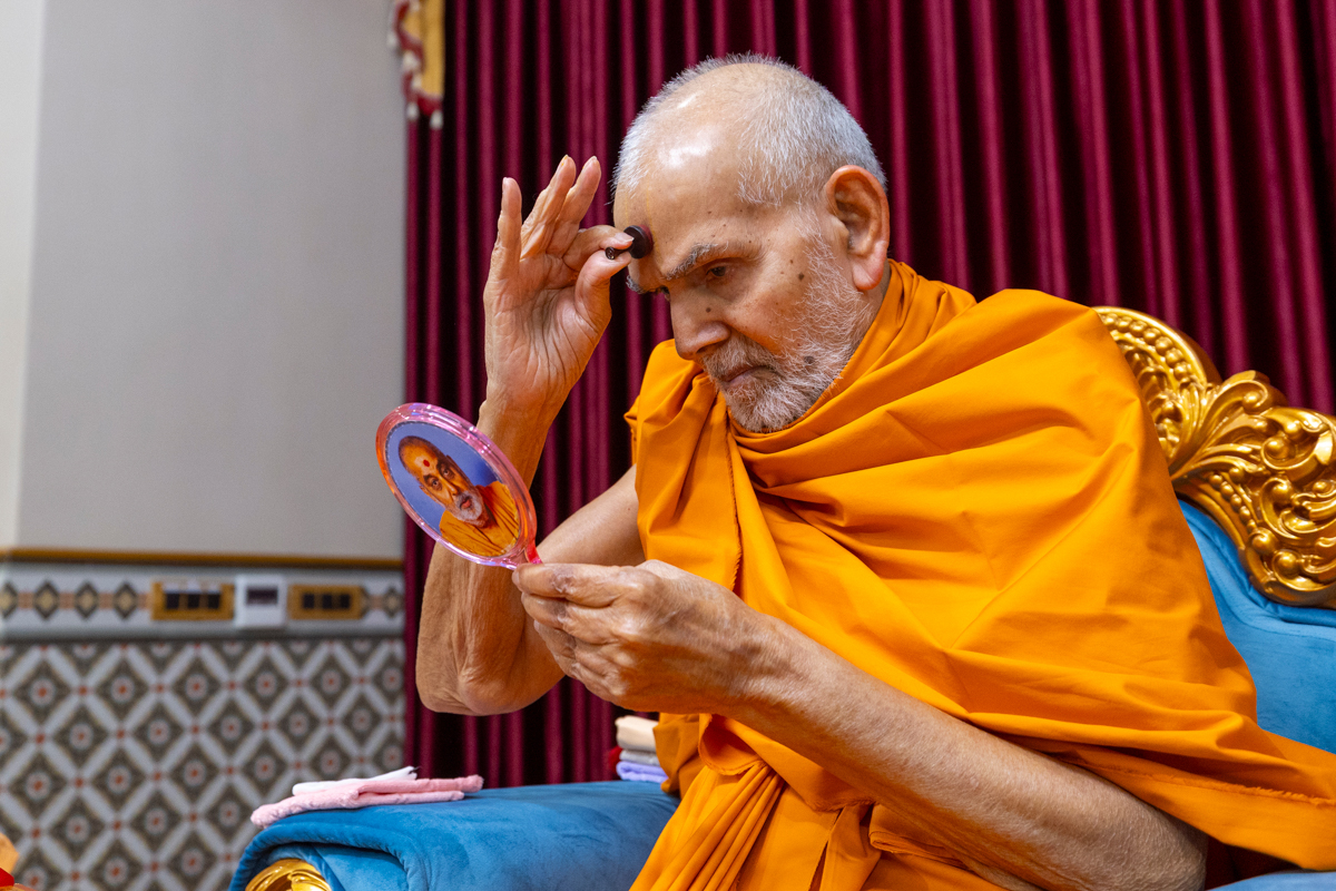 Param Pujya Mahant Swami Maharaj applies a tilak on his forehead
