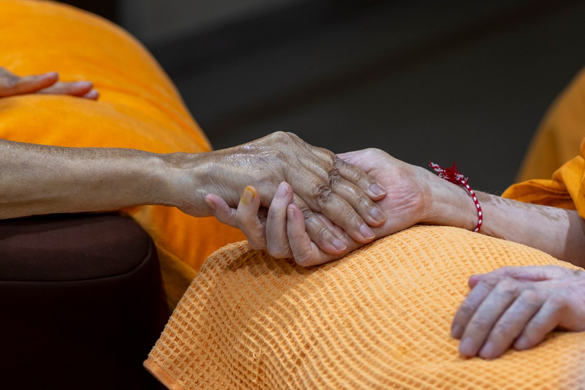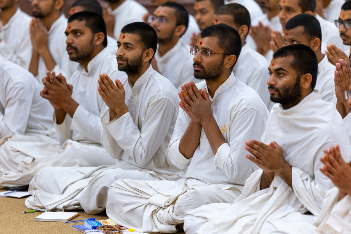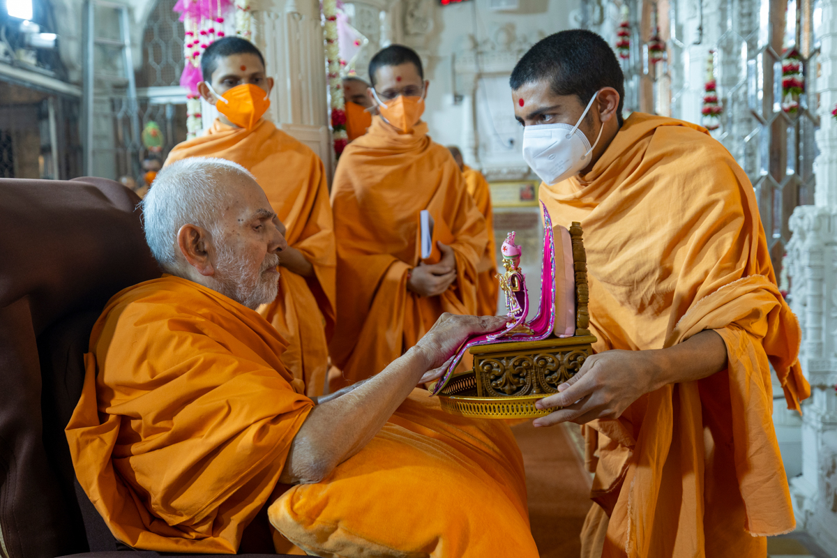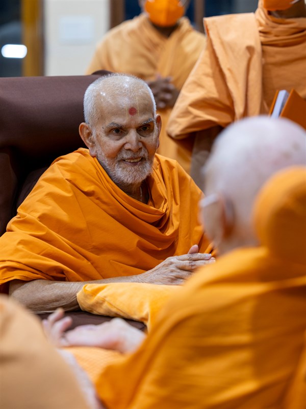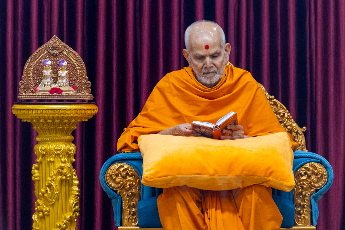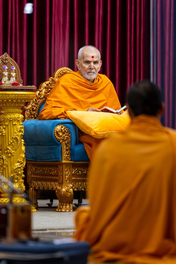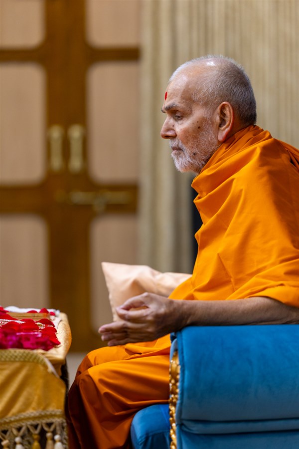 Swamishri listens to the sadhana mantra and daily prayer
