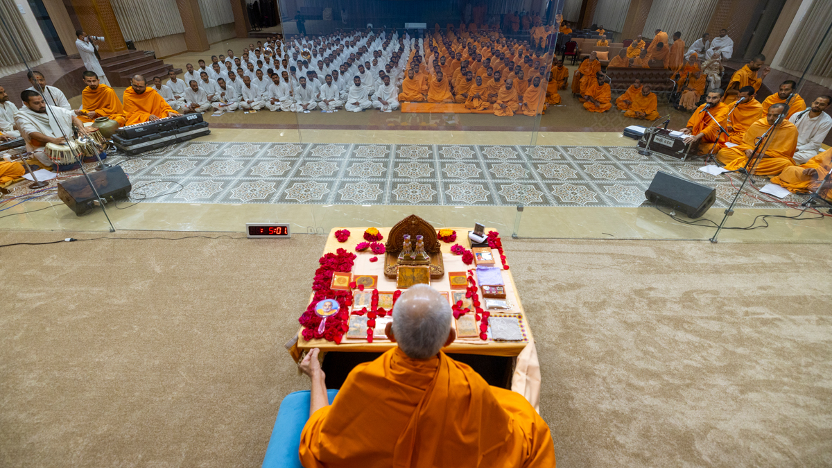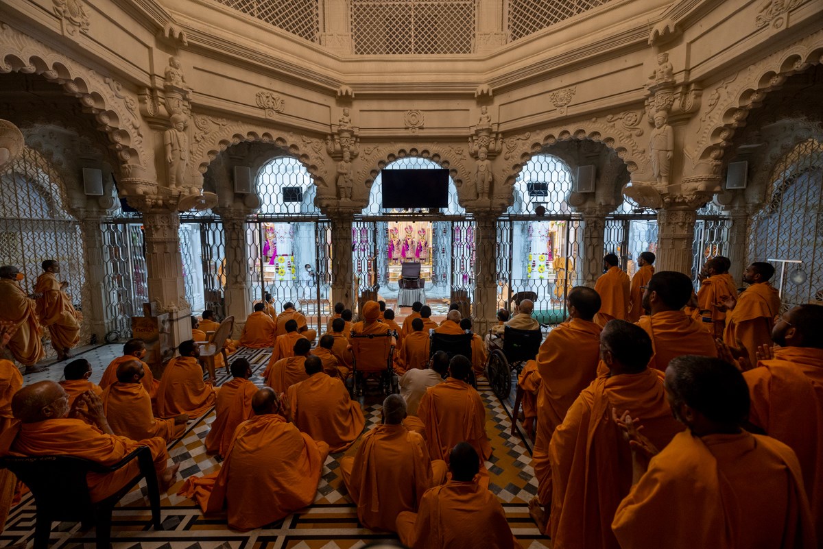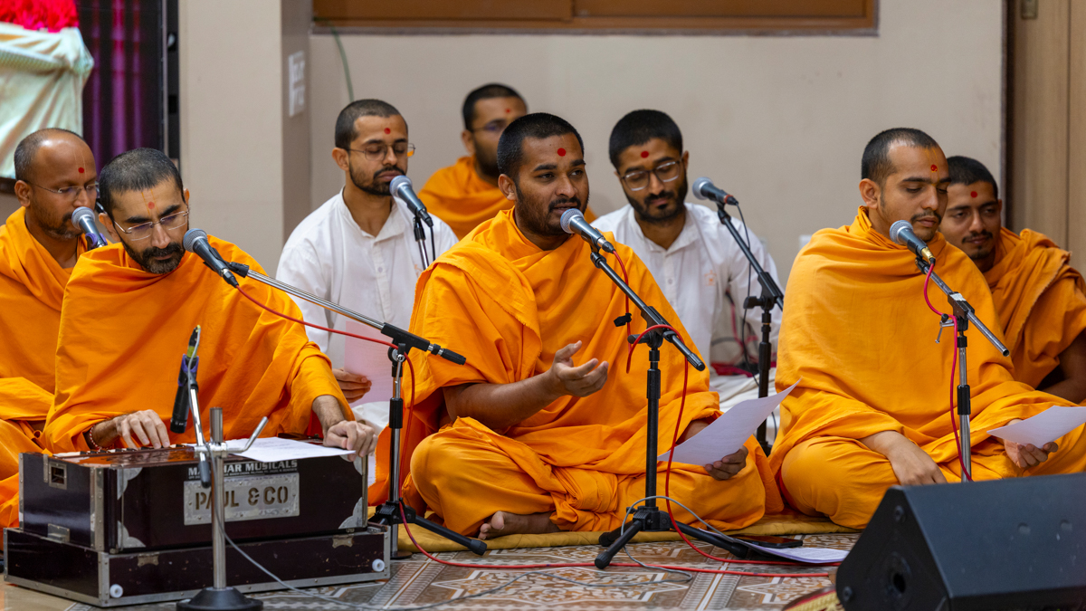 Swamis sing kirtans in Swamishri's daily puja