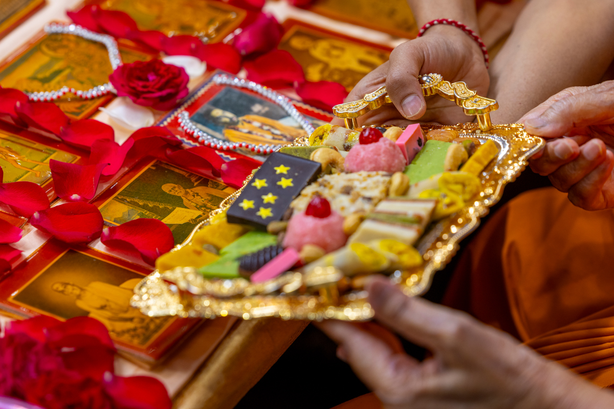 Swamishri offers thal to Shri Guru Parampara
