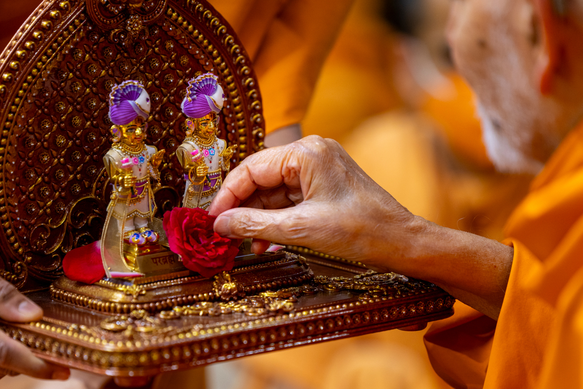 Swamishri places a flower at the feet of Shri Harikrishna Maharaj and Shri Gunatitanand Swami Maharaj