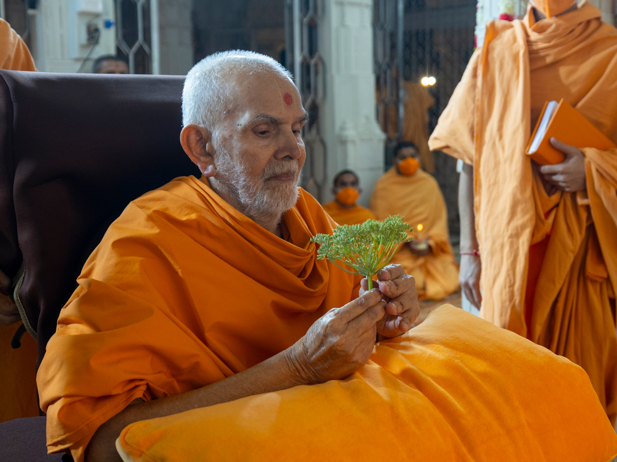 Swamishri observes fennel seeds (variyali)