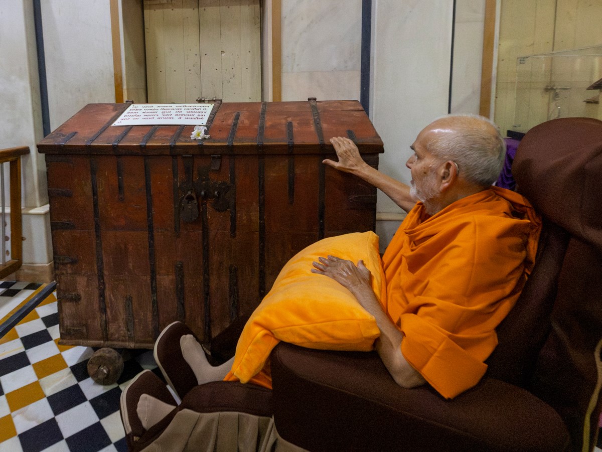 Swamishri engrossed in the darshan of a wooden storage chest sanctified by Brahmaswarup Shastriji Maharaj