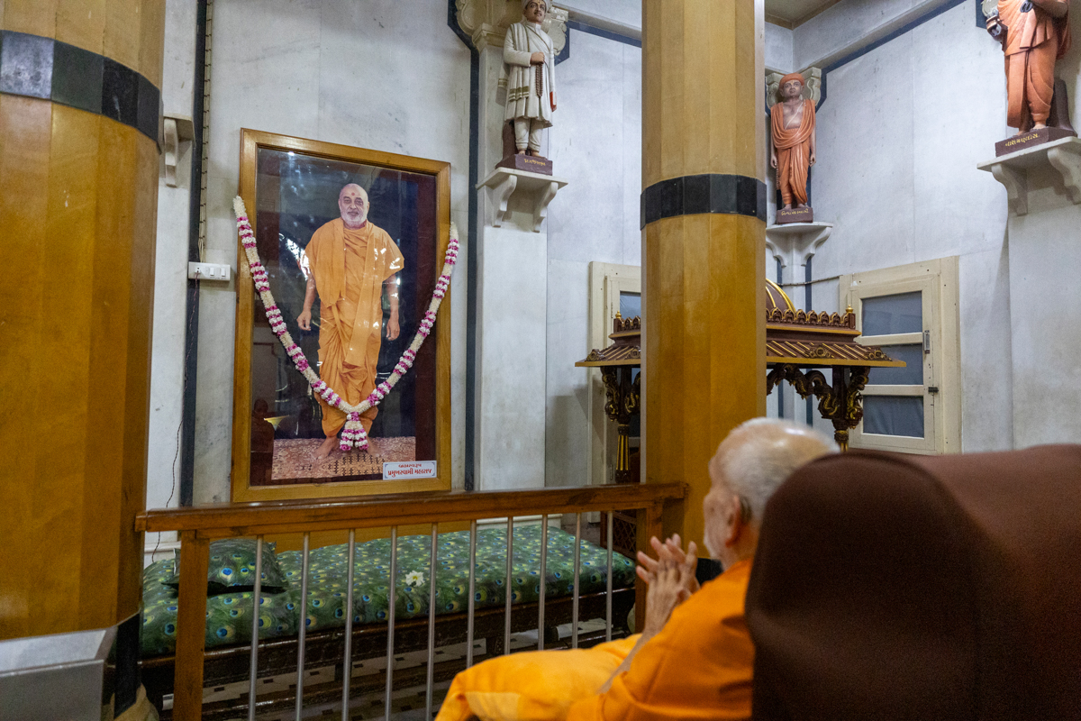Swamishri engrossed in darshan of Shri Harikrishna Maharaj and Shri Gunatitanand Swami Maharaj
