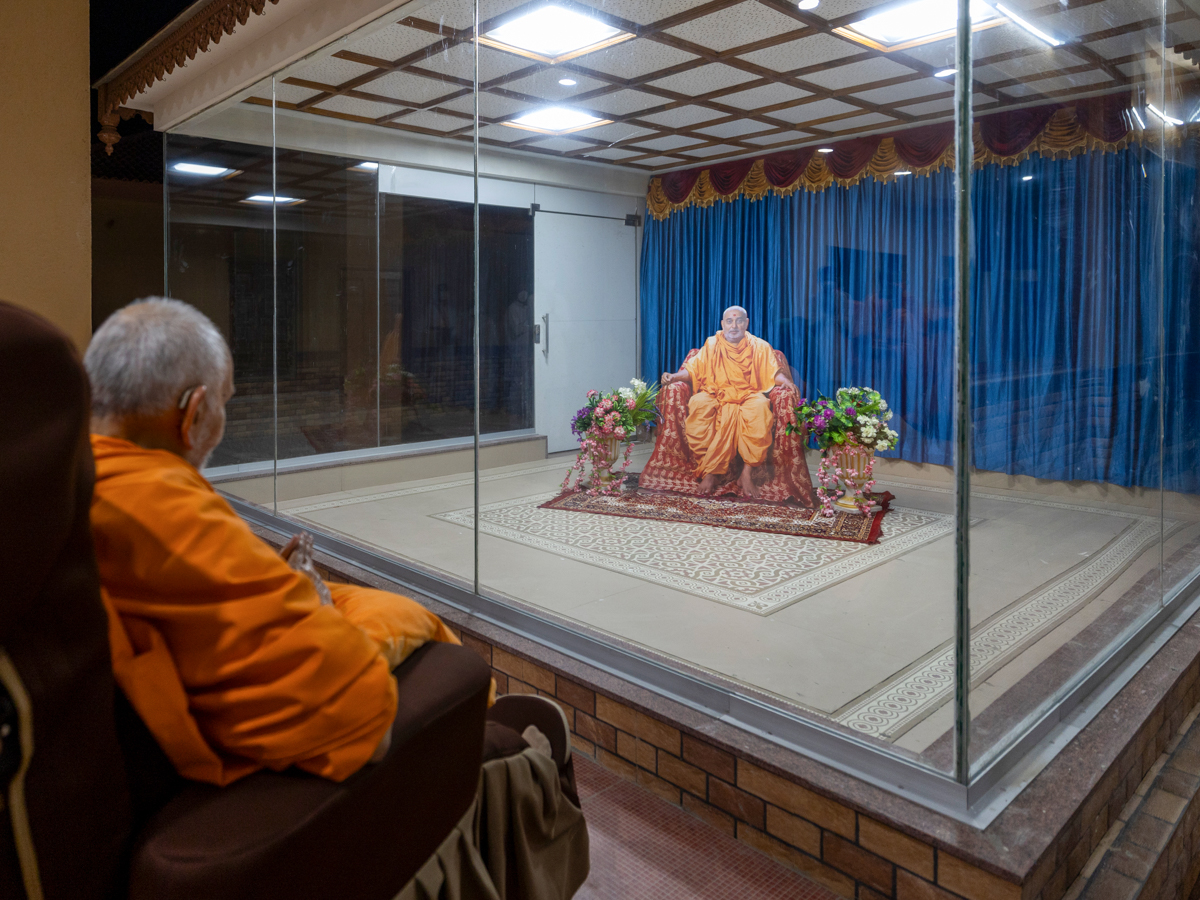 Swamishri engrossed in darshan of Brahmaswarup Pramukh Swami Maharaj