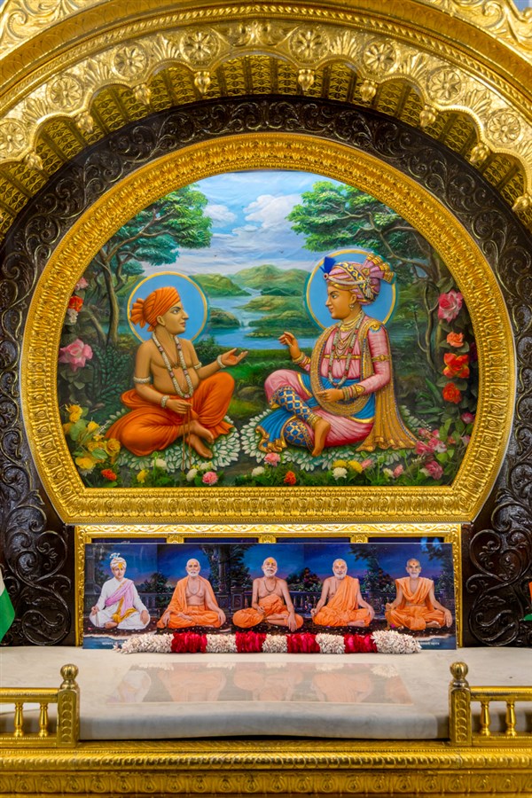 Param Pujya Mahant Swami Maharaj engrossed in darshan of Shri Harikrishna Maharaj and Shri Gunatitanand Swami Maharaj
