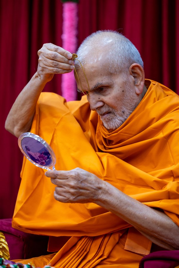 Swamishri applies a tilak on his forehead