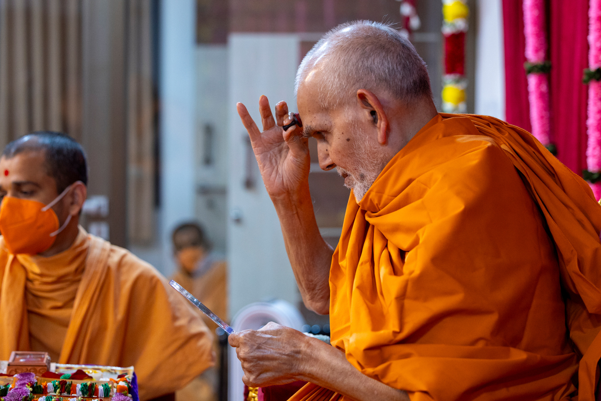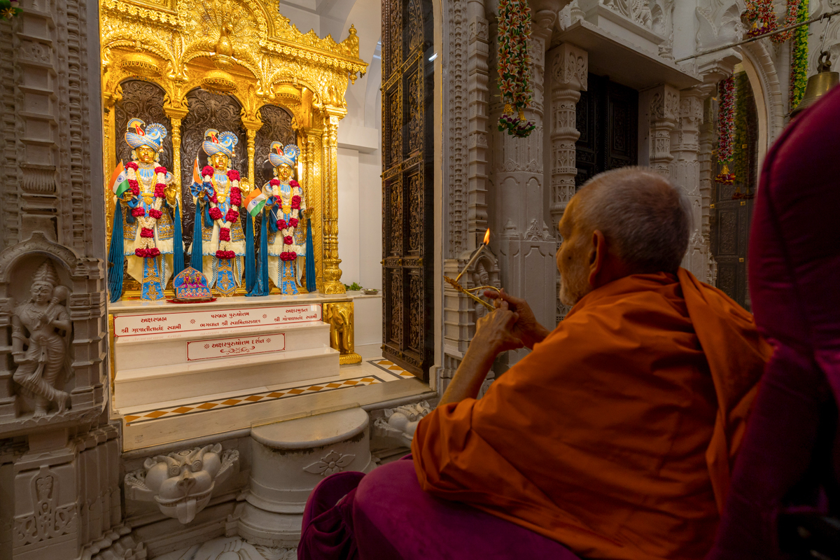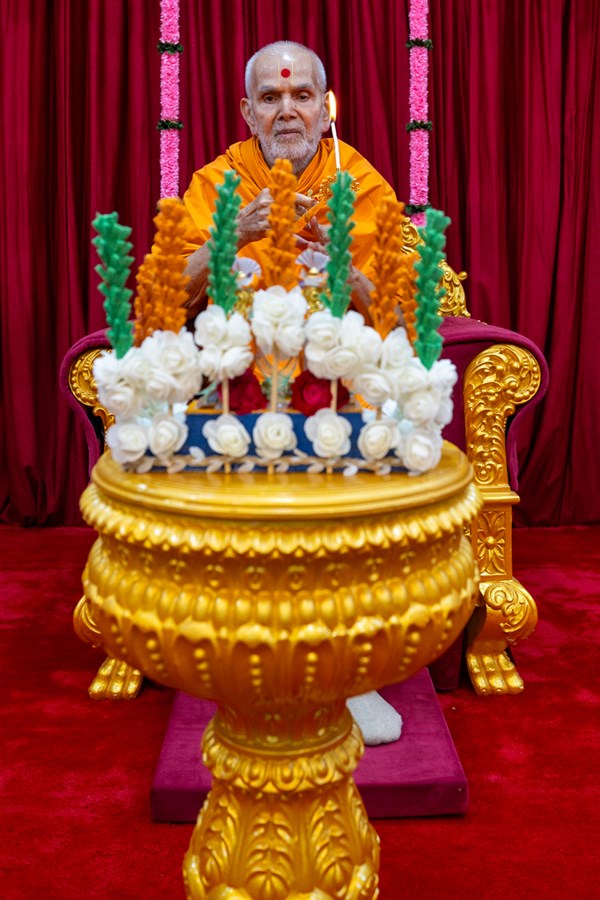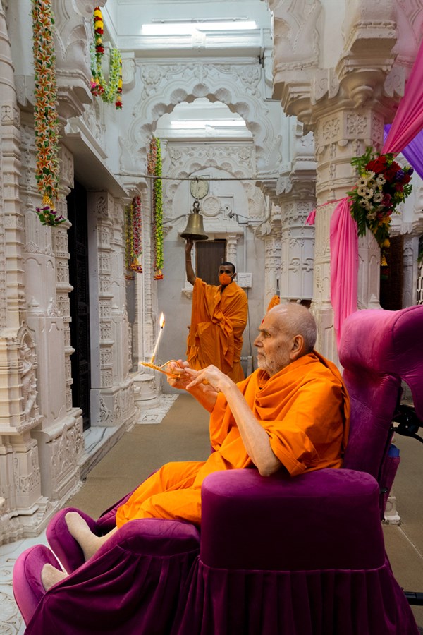 Swamishri performs the morning arti