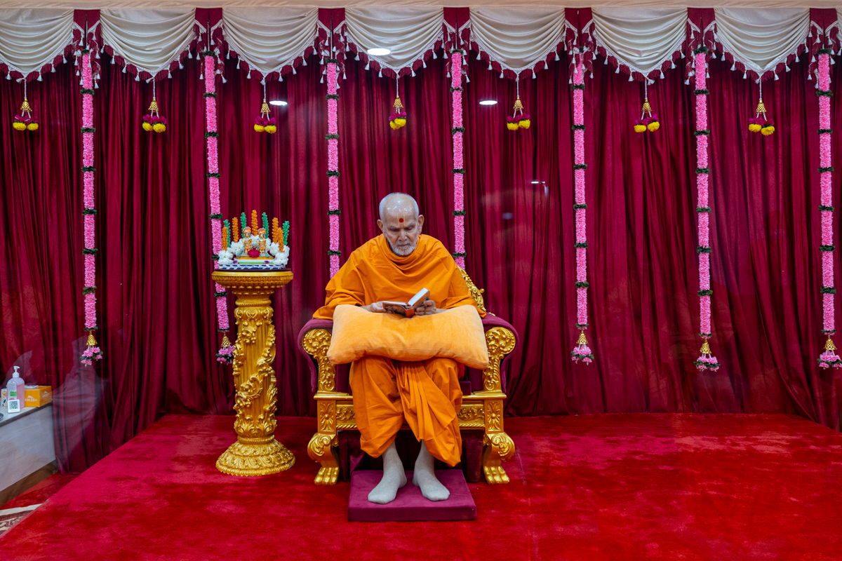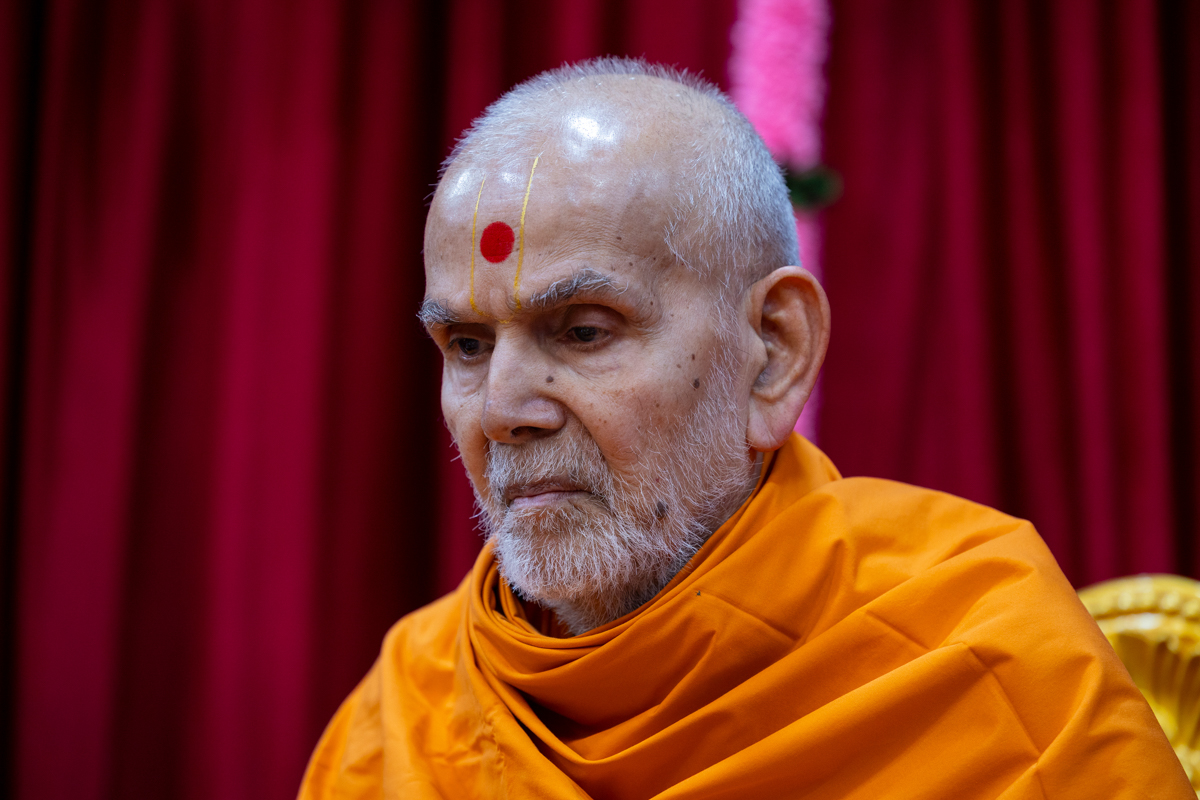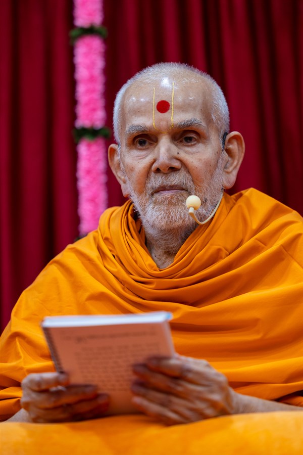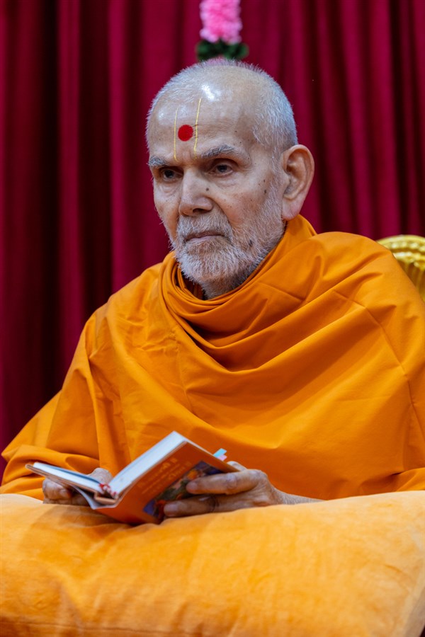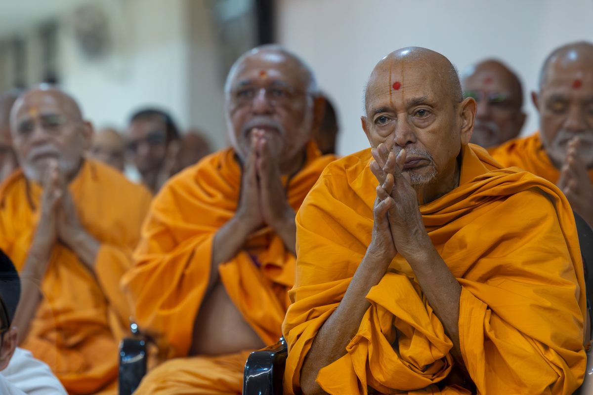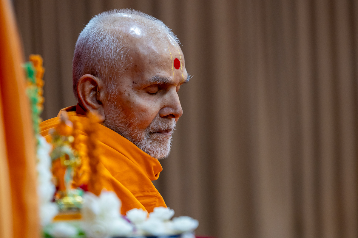 Swamishri listens to the sadhana mantra and daily prayer