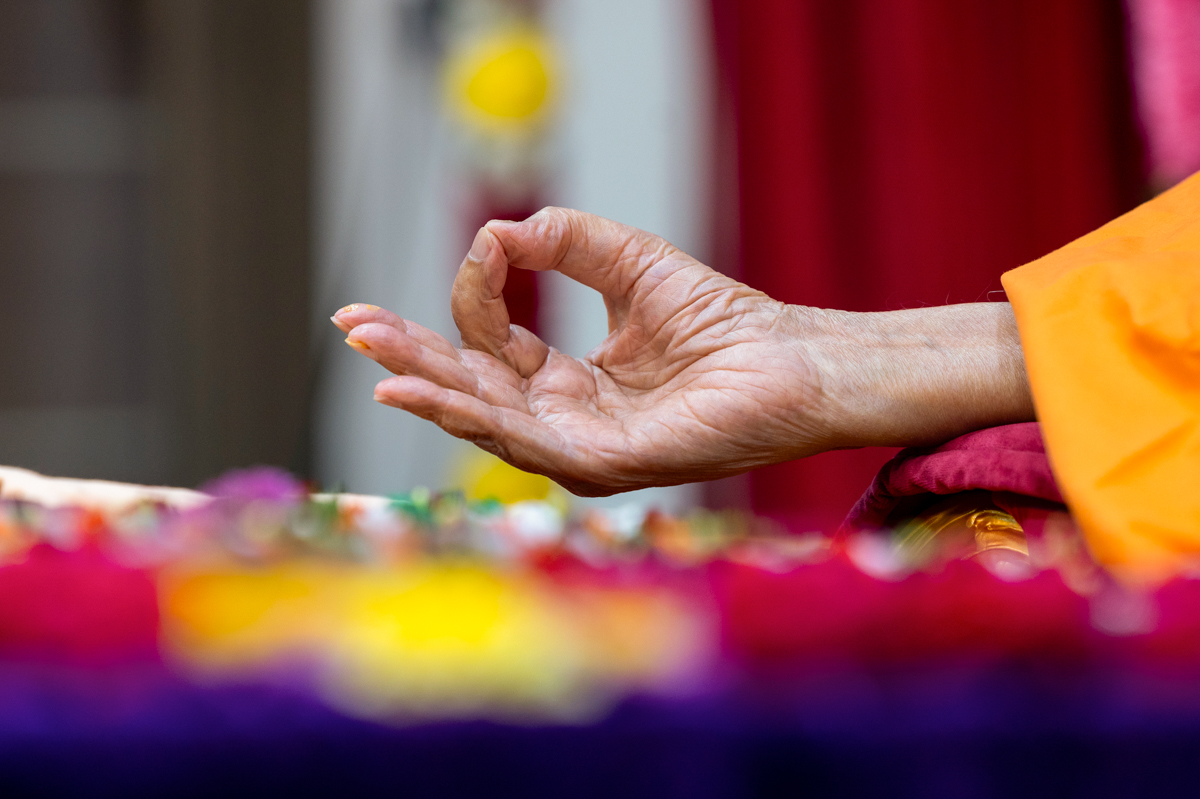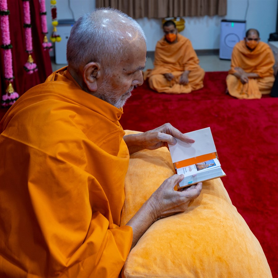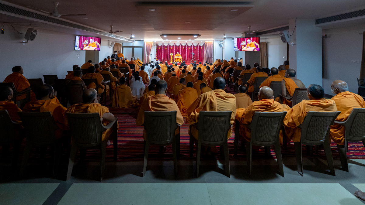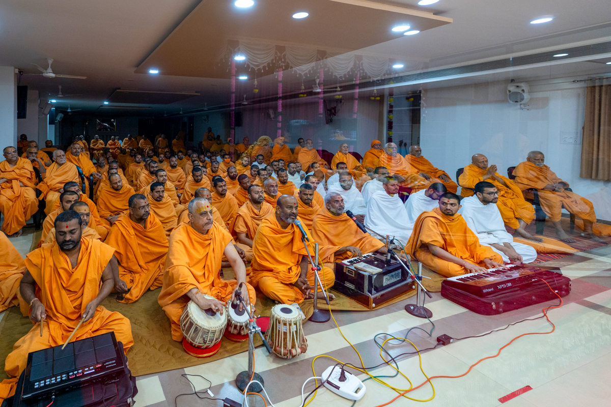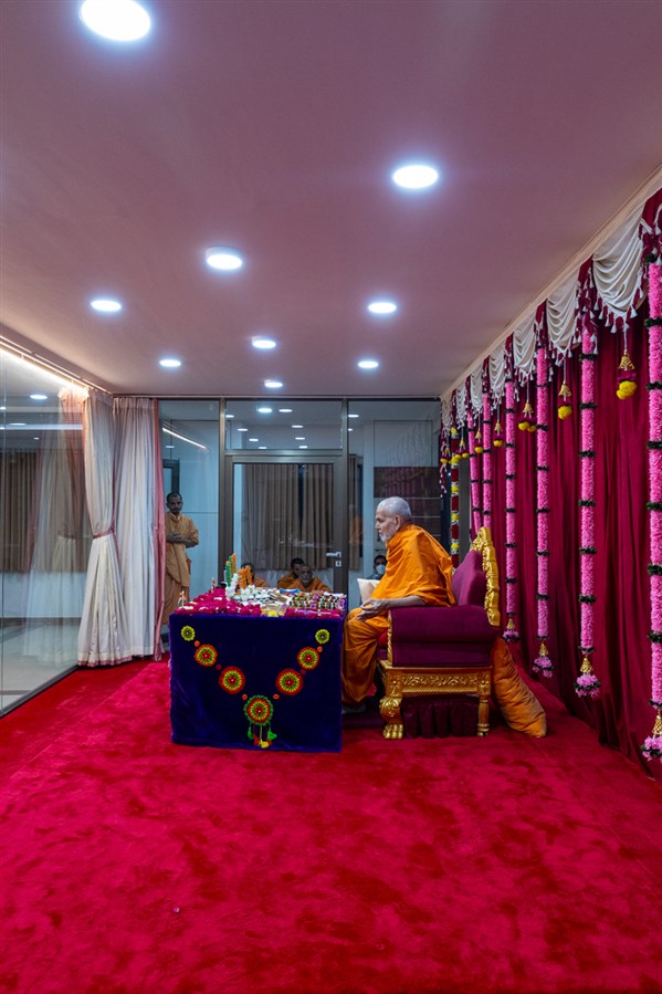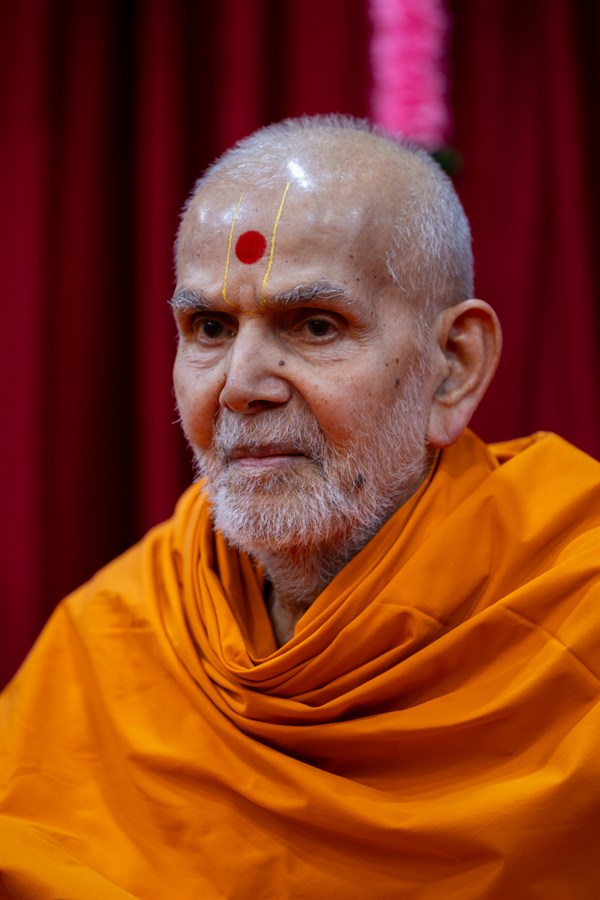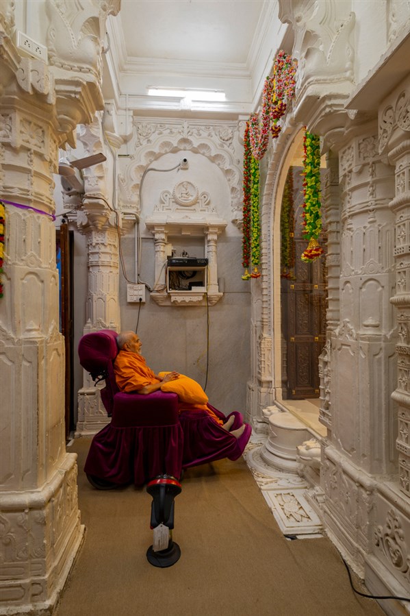 Swamishri listens to the sadhana mantra and daily prayer