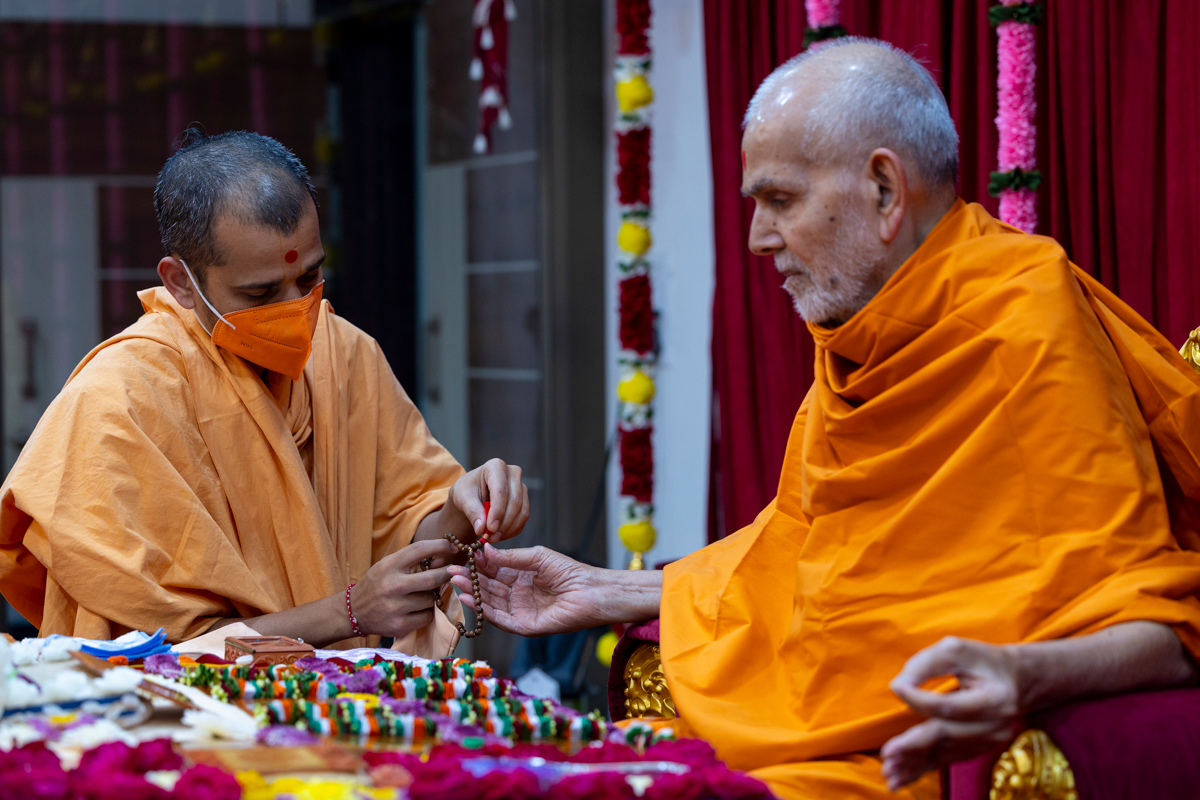 Swamishri turns the mala in his daily puja