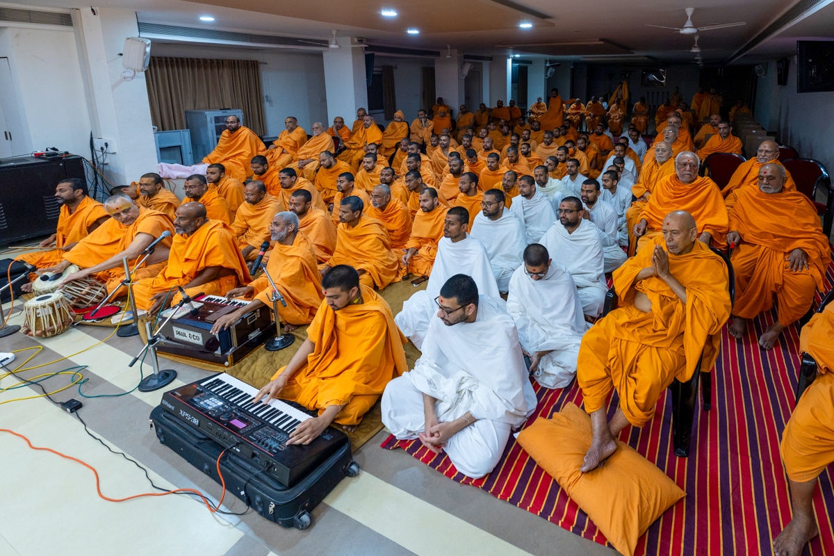 A swami sings a kirtan in Swamishri's daily puja