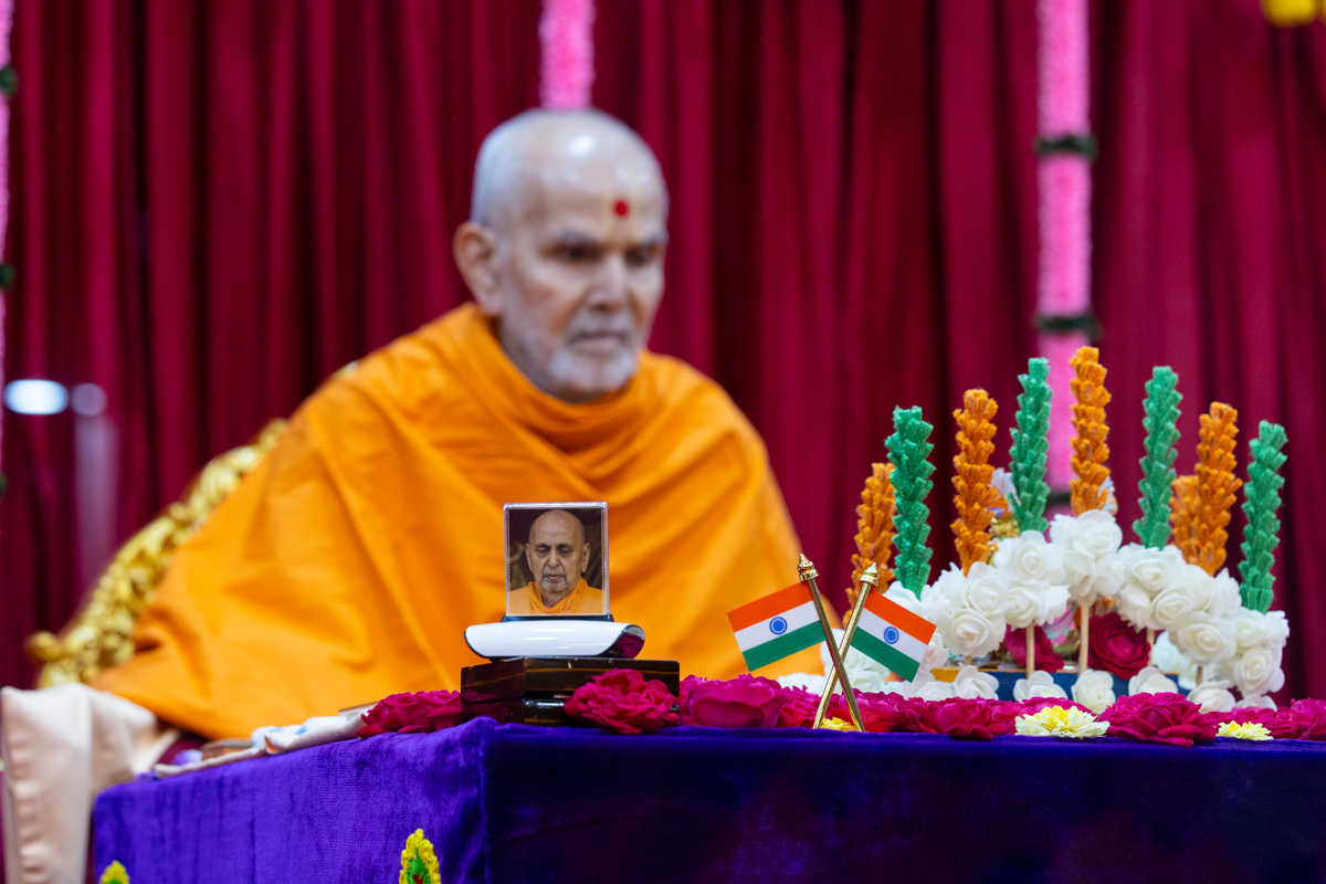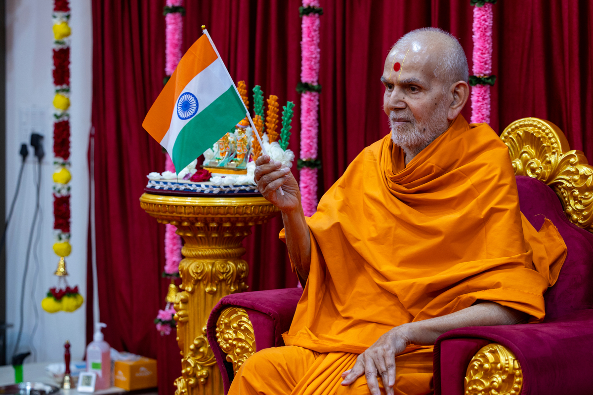 Swamishri waves an Indian flag to commemorate India's Republic Day