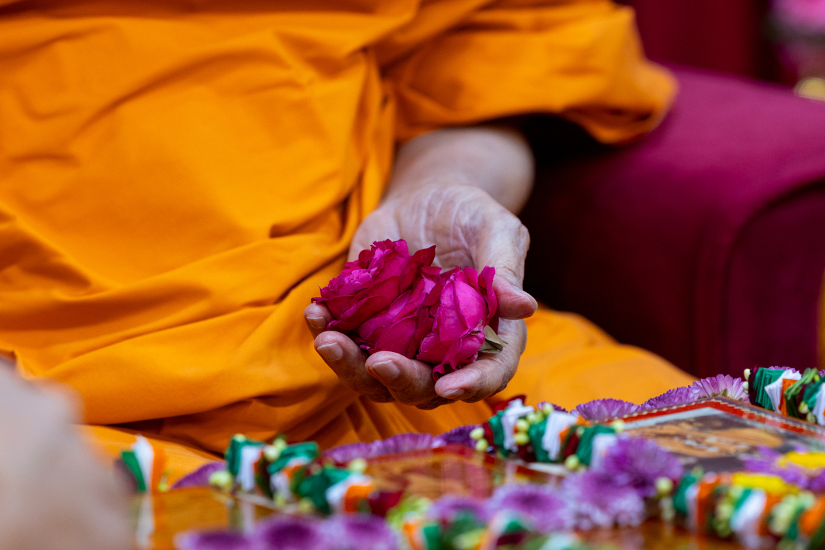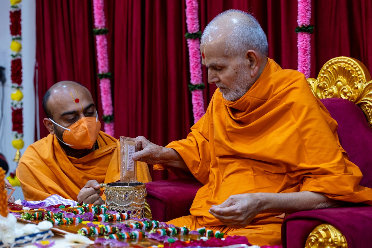 Swamishri adds flowers to the sanctified water