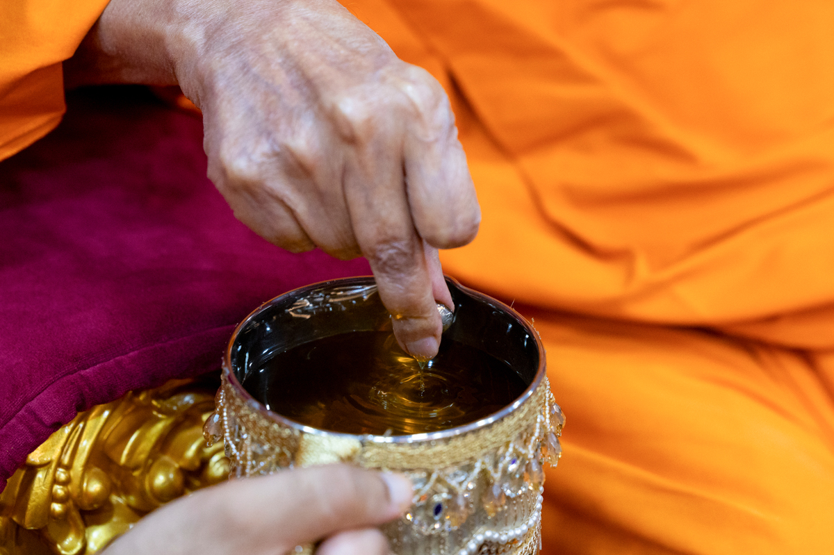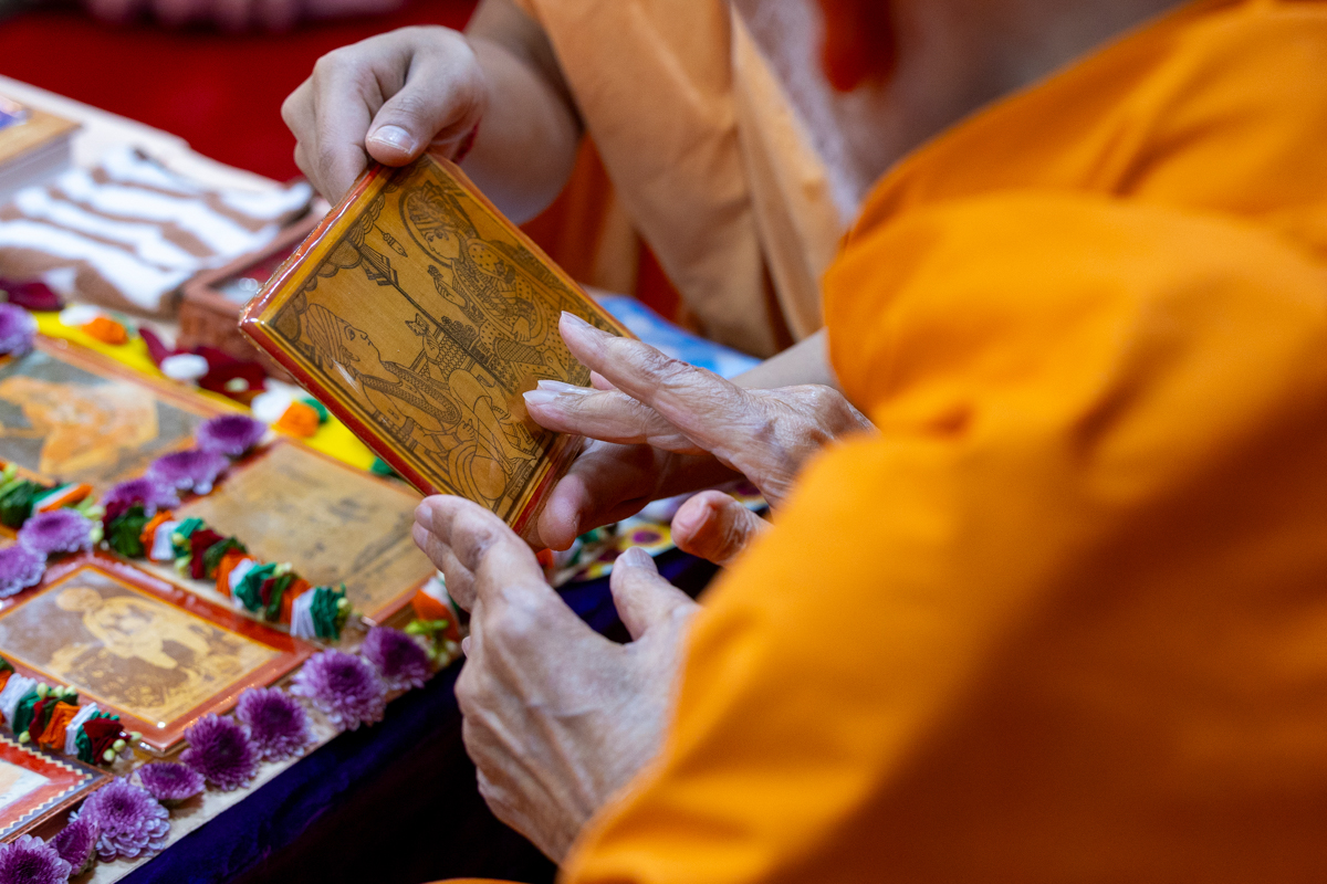 Swamishri sanctifies water with the holy relics of Bhagwan Swaminarayan and the Guru Parampara