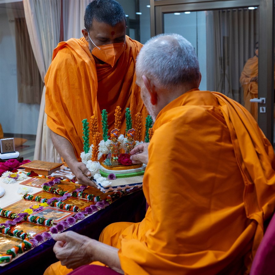 Swamishri places a flower at the feet of Shri Harikrishna Maharaj and Shri Gunatitanand Swami Maharaj