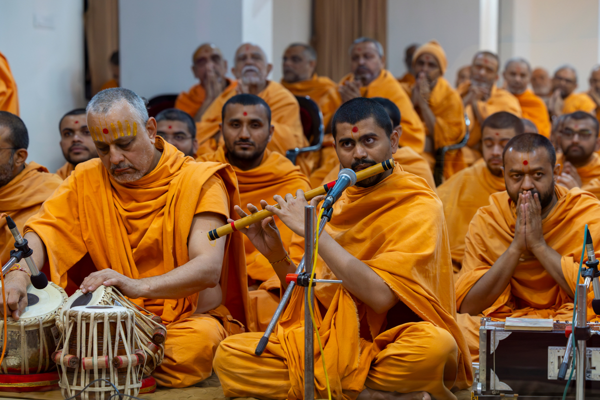 A swami plays the flute in Swamishri's daily puja