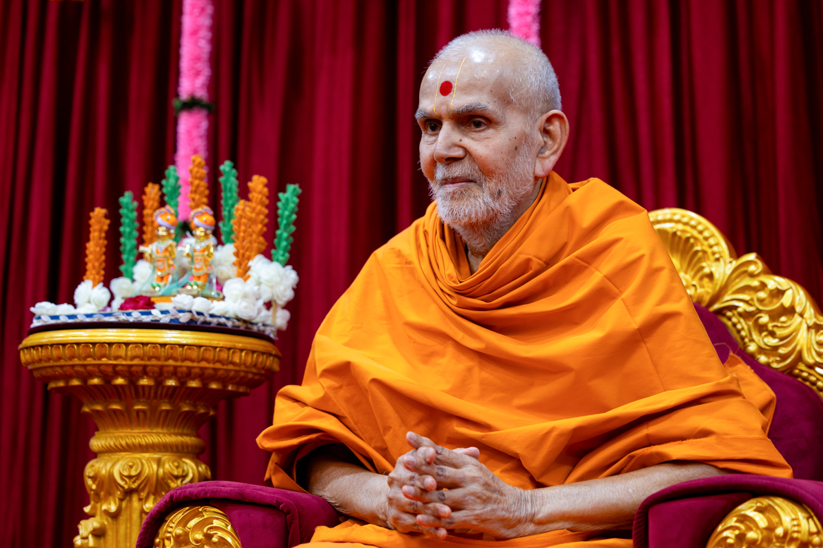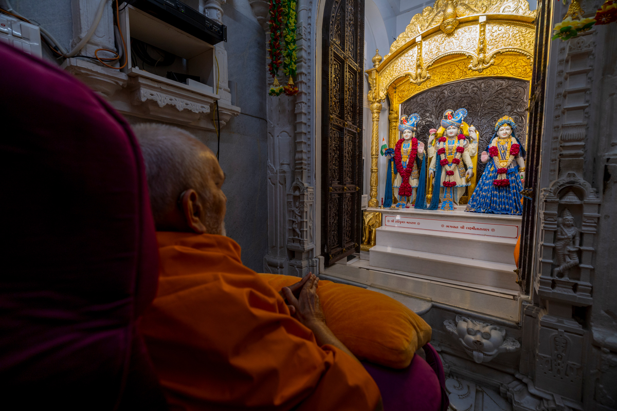 Swamishri engrossed in darshan of Shri Harikrishna Maharaj and Shri Lakshmi-Narayan Bhagwan
