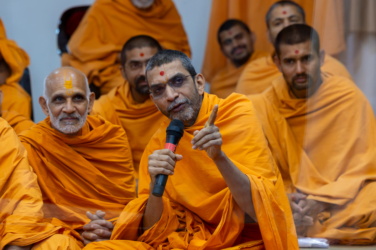 Swamishri listens to Pujya Tyagvallabh Swami