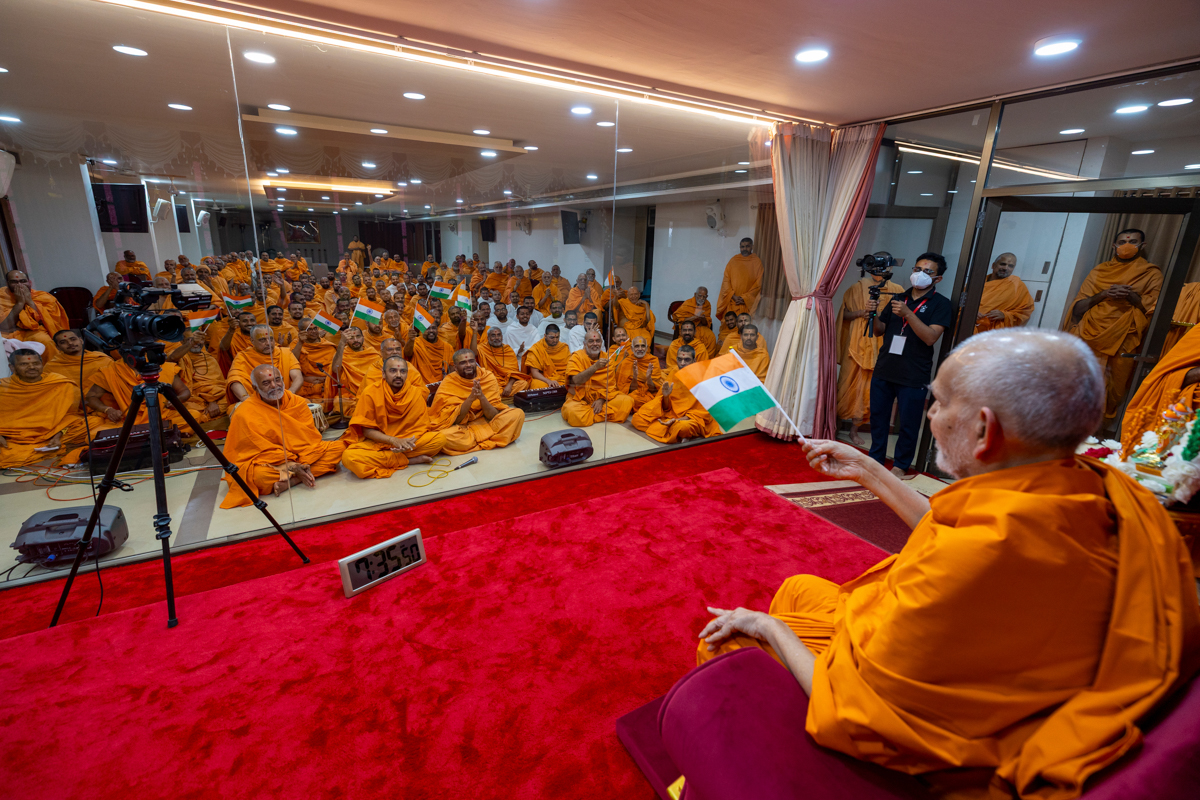 Swamishri and swamis wave Indian flags