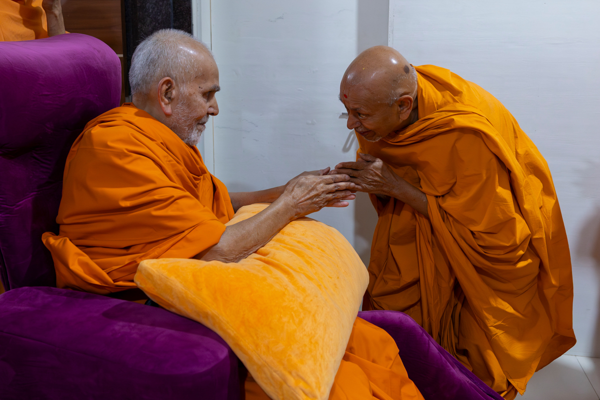 Pujya Tyagvallabh Swami greets Swamishri
