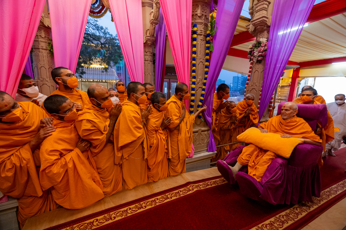 Swamis and parshads doing darshan of Swamishri