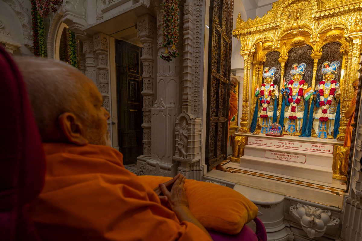 Swamishri engrossed in darshan of Bhagwan Swaminarayan, Aksharbrahma Gunatitanand Swami and Shri Gopalanand Swami