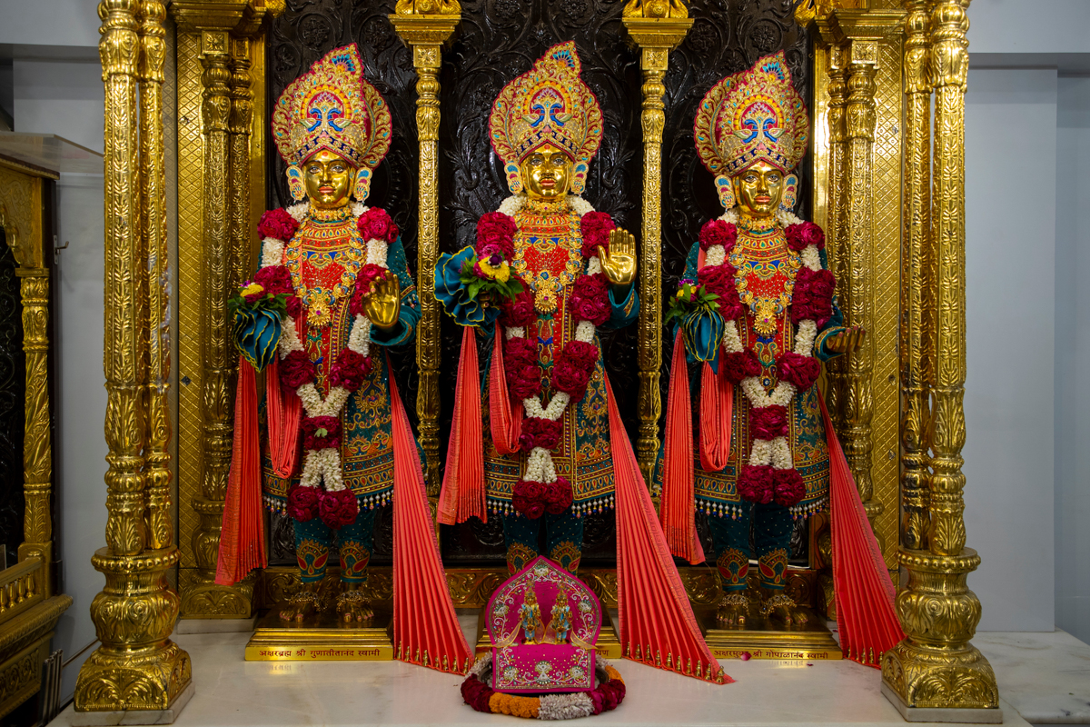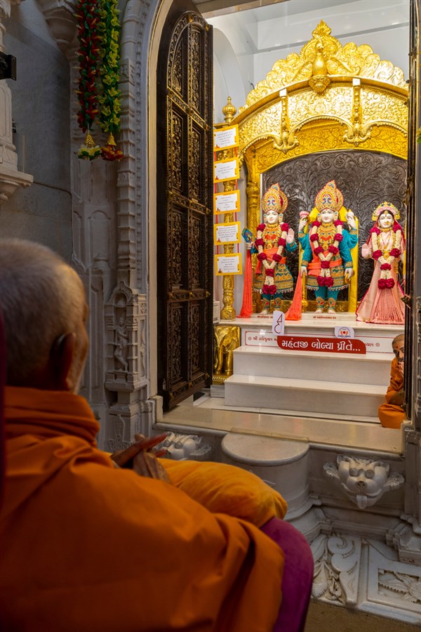 Swamishri engrossed in darshan of Bhagwan Swaminarayan, Aksharbrahma Gunatitanand Swami and Shri Gopalanand Swami