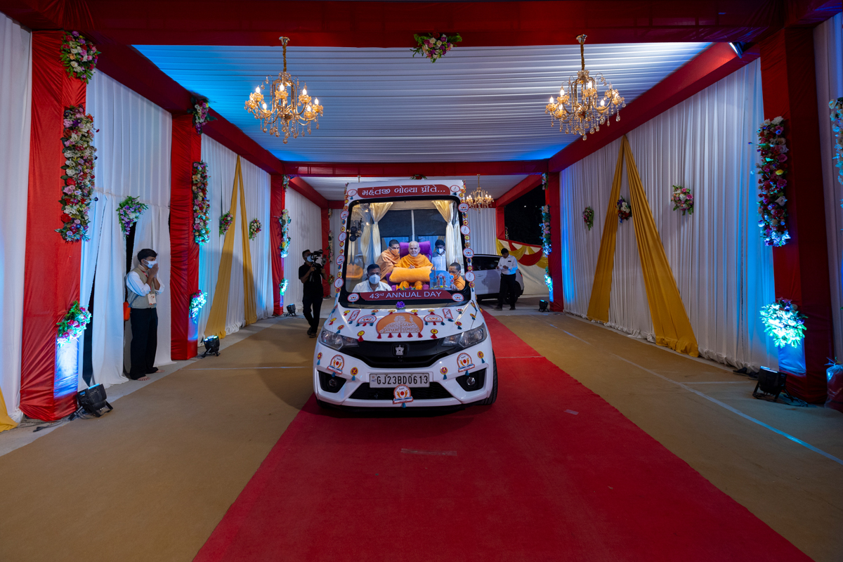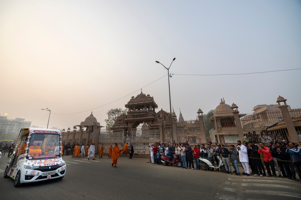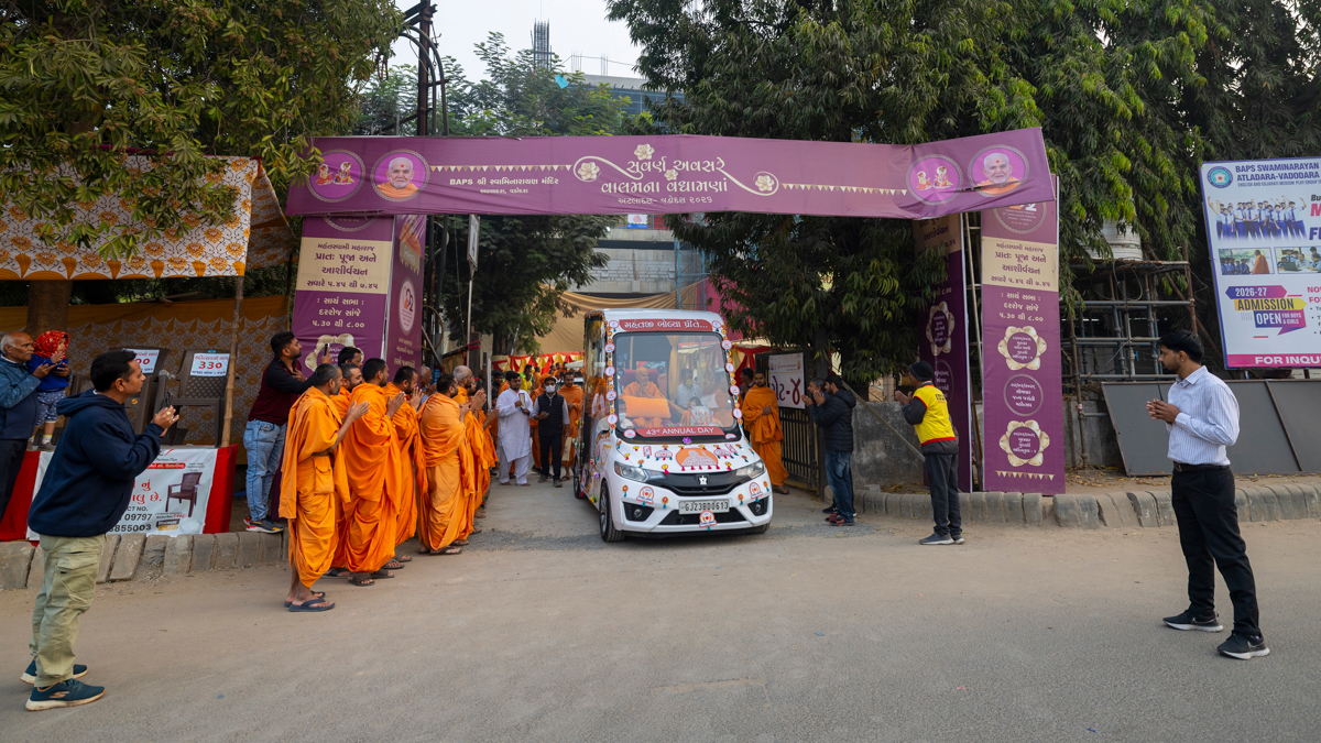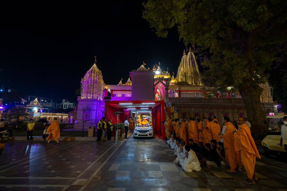 Swamishri returns to BAPS Shri Swaminarayan Mandir, Atladara (Vadodara), after his daily puja