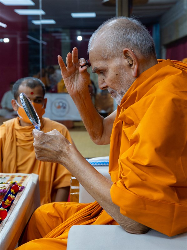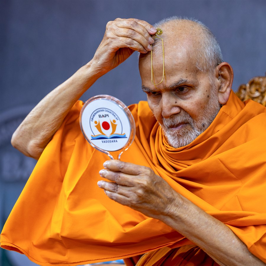 Swamishri applies a tilak on his forehead