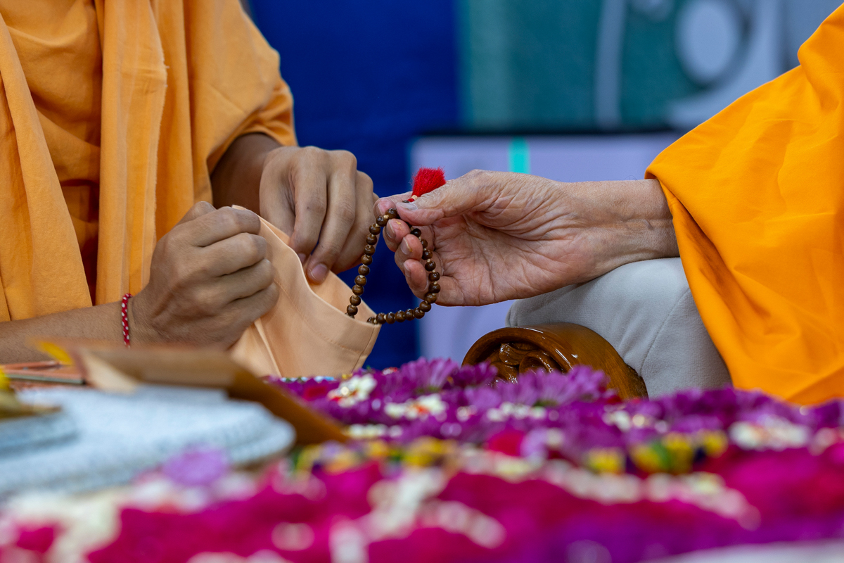Swamishri prepares to turn the mala in his daily puja