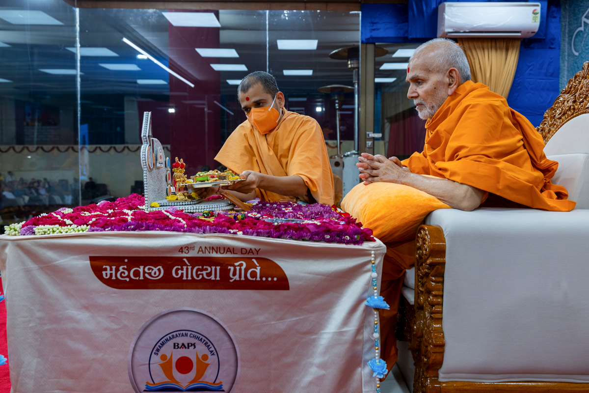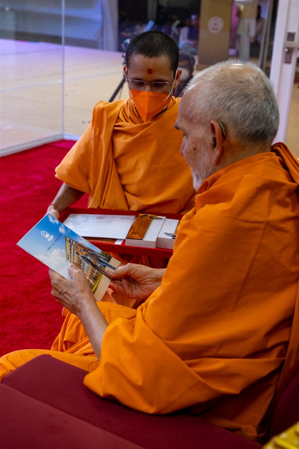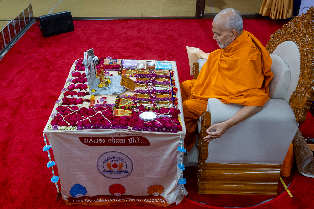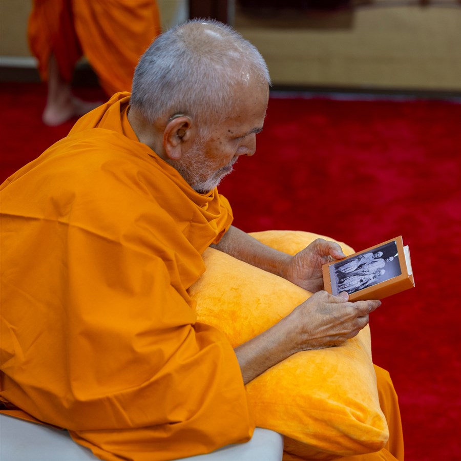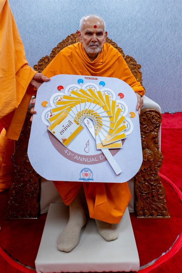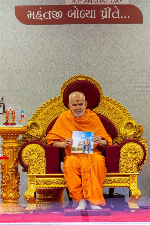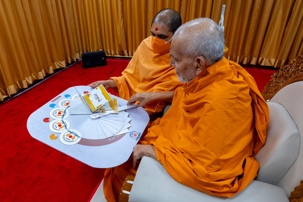 Swamishri observes an invitation card for the evening Chhatralaya Din assembly