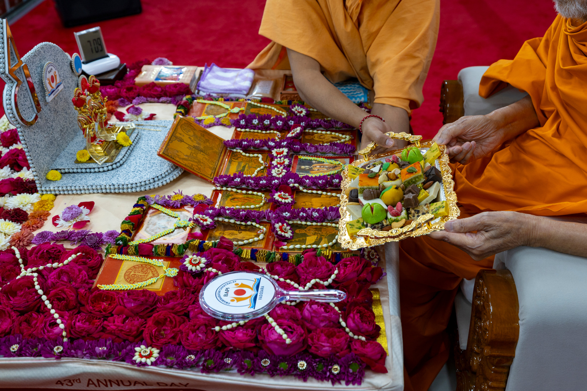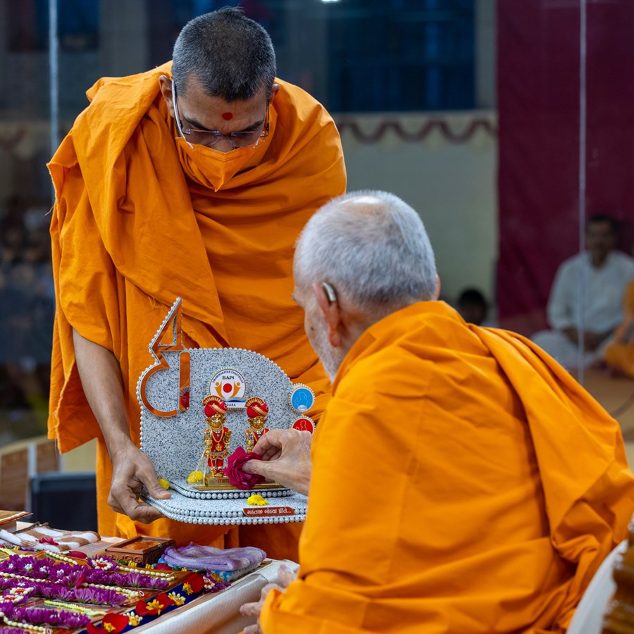 Swamishri offers thal to Shri Guru Parampara