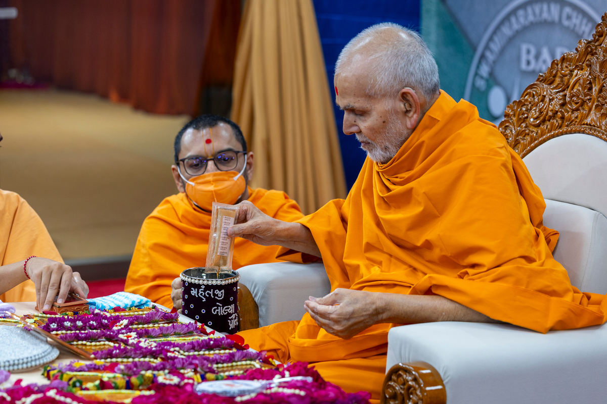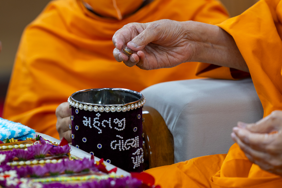 Swamishri sanctifies water with the holy relics of Bhagwan Swaminarayan and the Guru Parampara