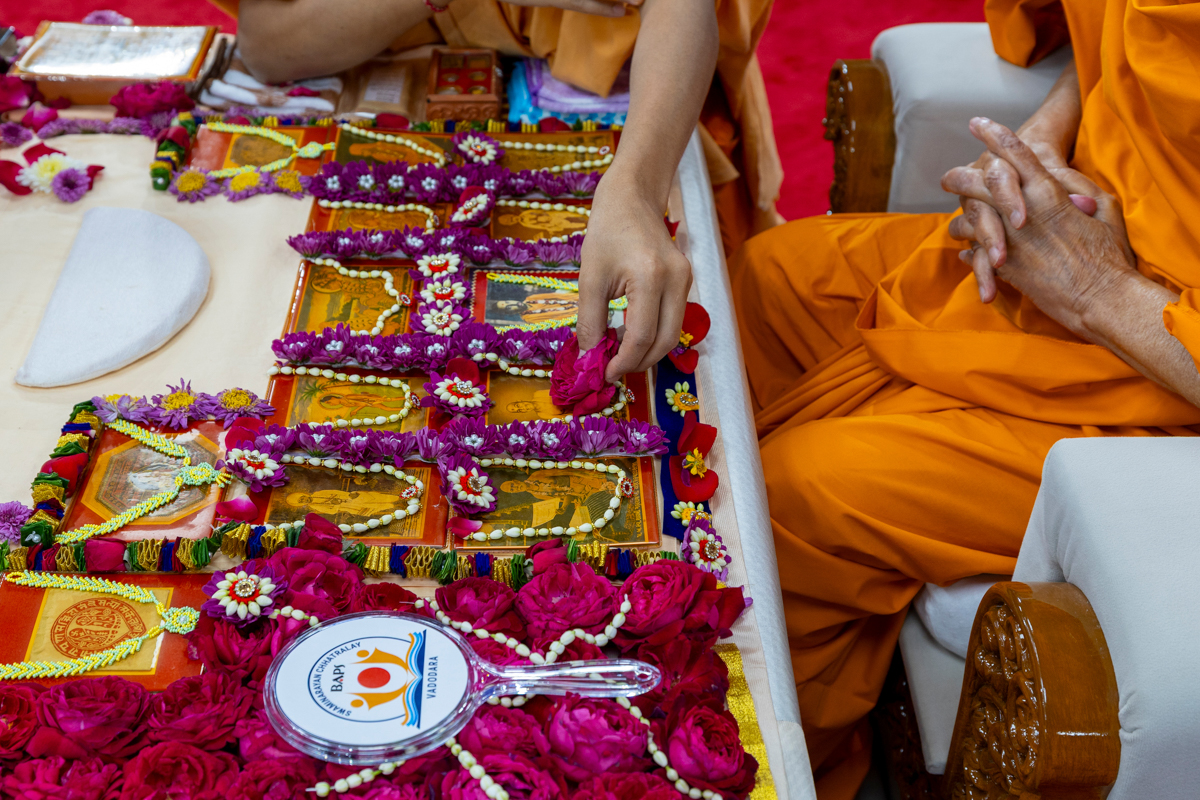 Swamishri places a flower at the feet of Shri Harikrishna Maharaj and Shri Gunatitanand Swami Maharaj