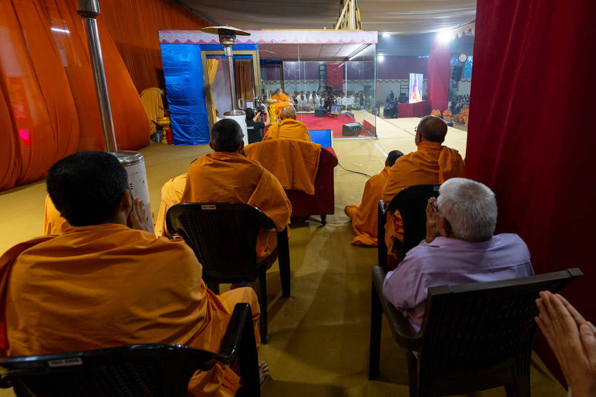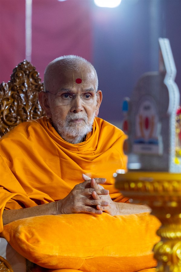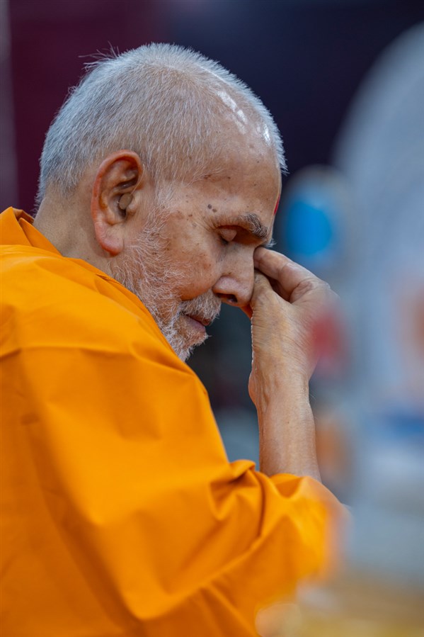 Swamishri listens to the sadhana mantra and daily prayer