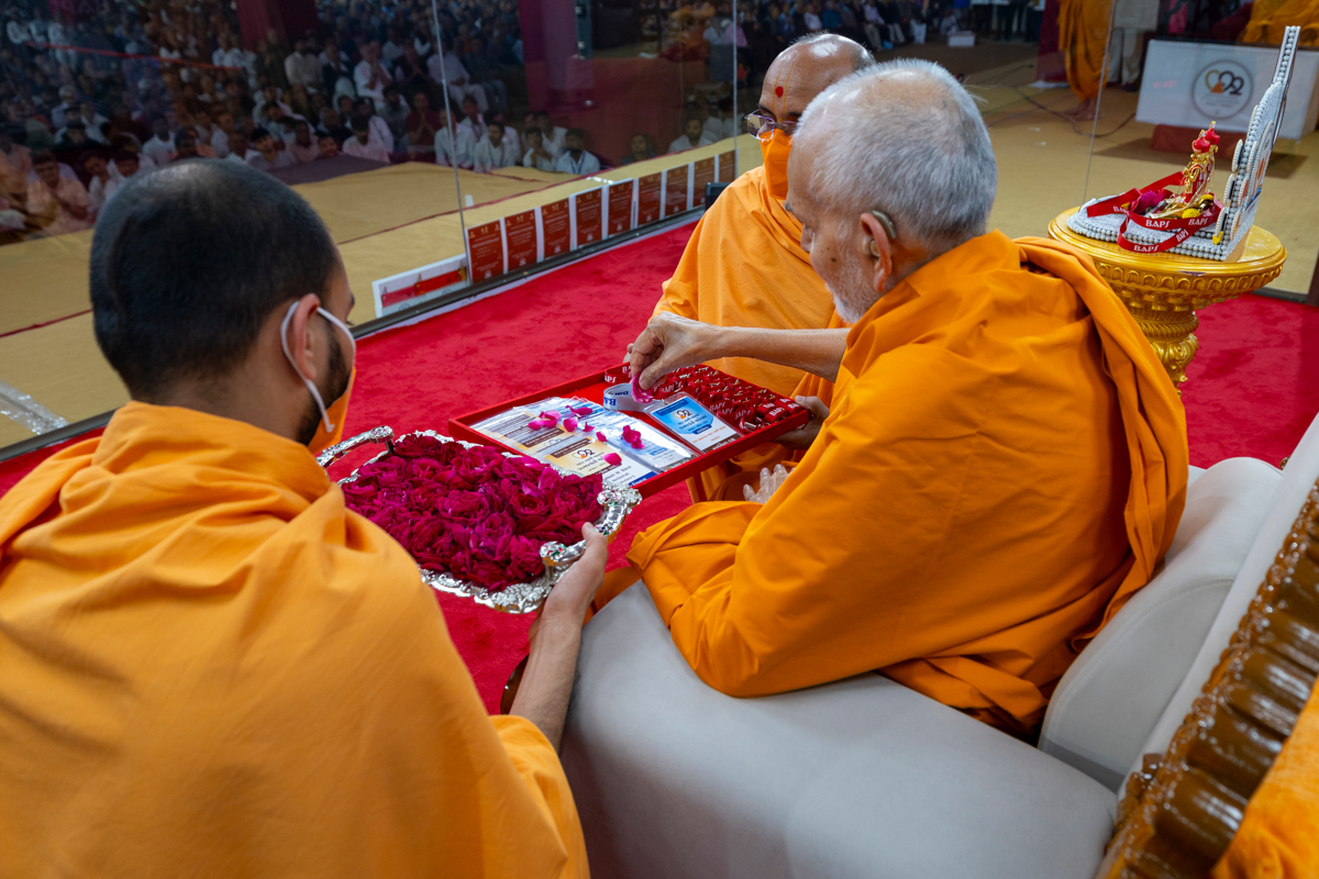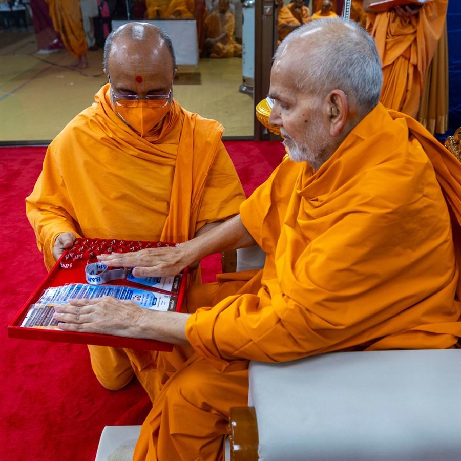 Swamishri sanctifies identity cards for volunteers