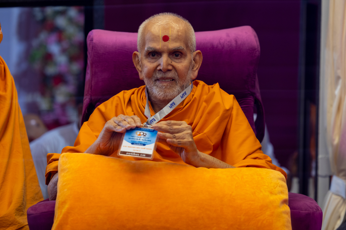 Swamishri displays his identity card