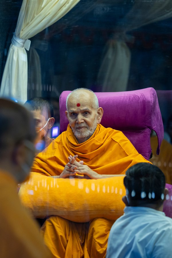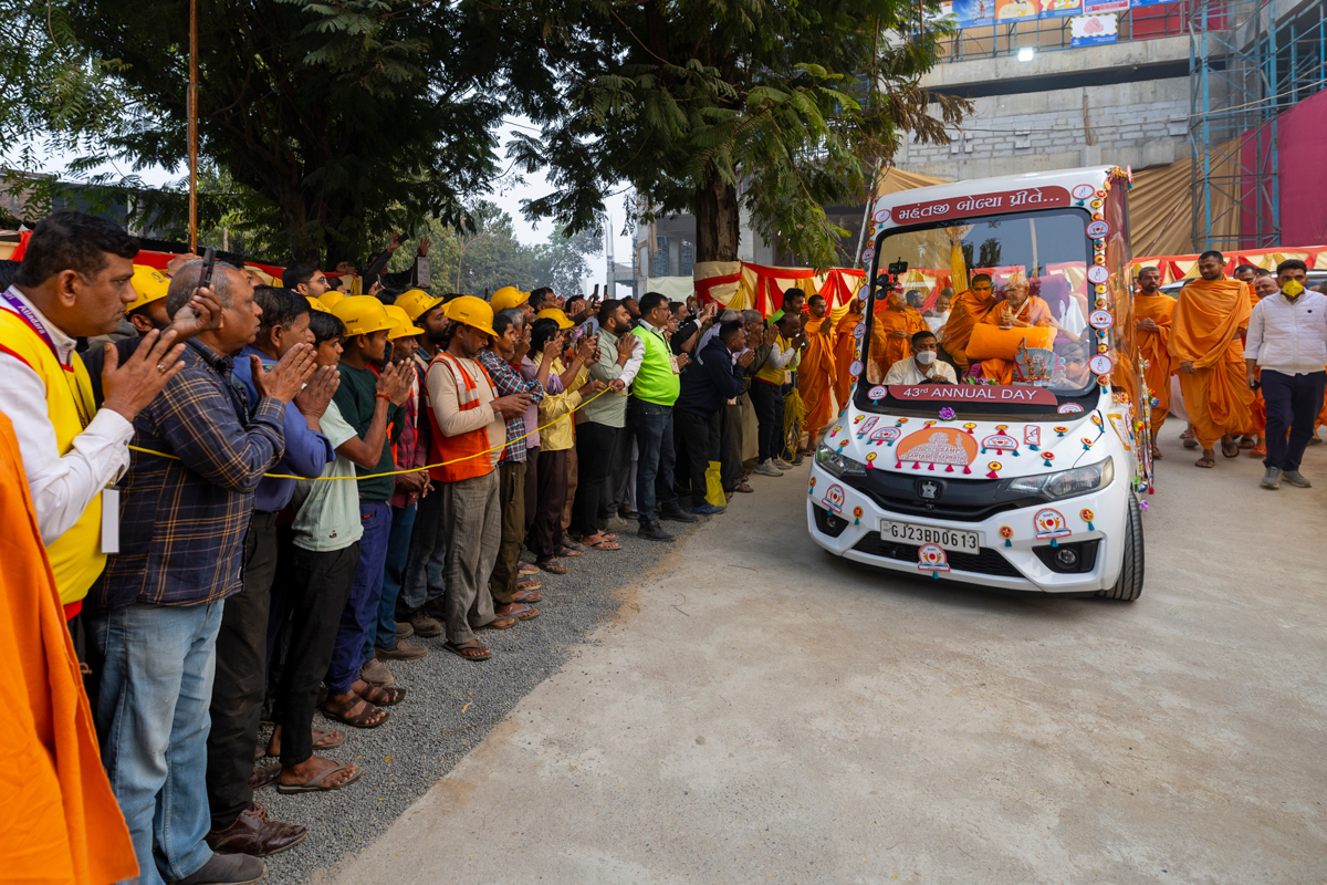 Swamishri greets all with folded hands in the evening