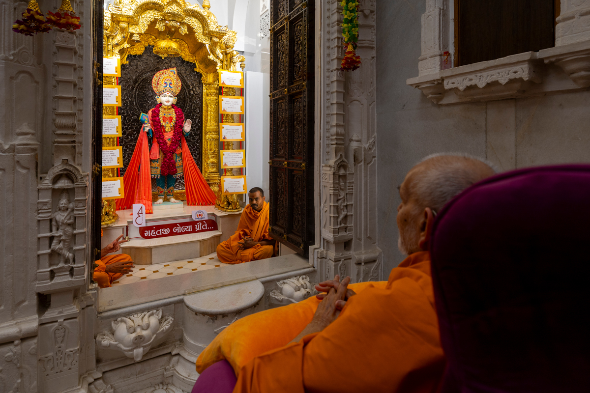 Swamishri engrossed in darshan of Shri Harikrishna Maharaj and Shri Lakshmi-Narayan Bhagwan
