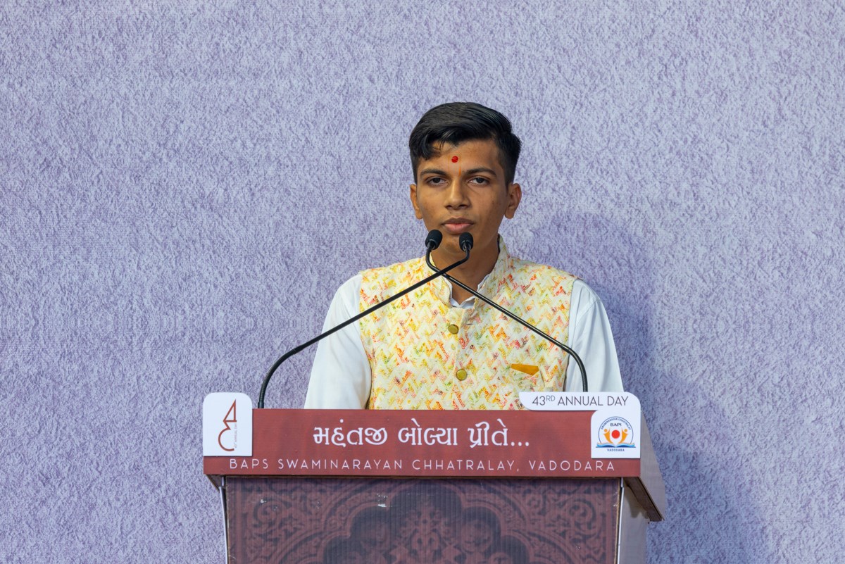 A yuvak addresses the evening 'Chhatralaya Din' assembly