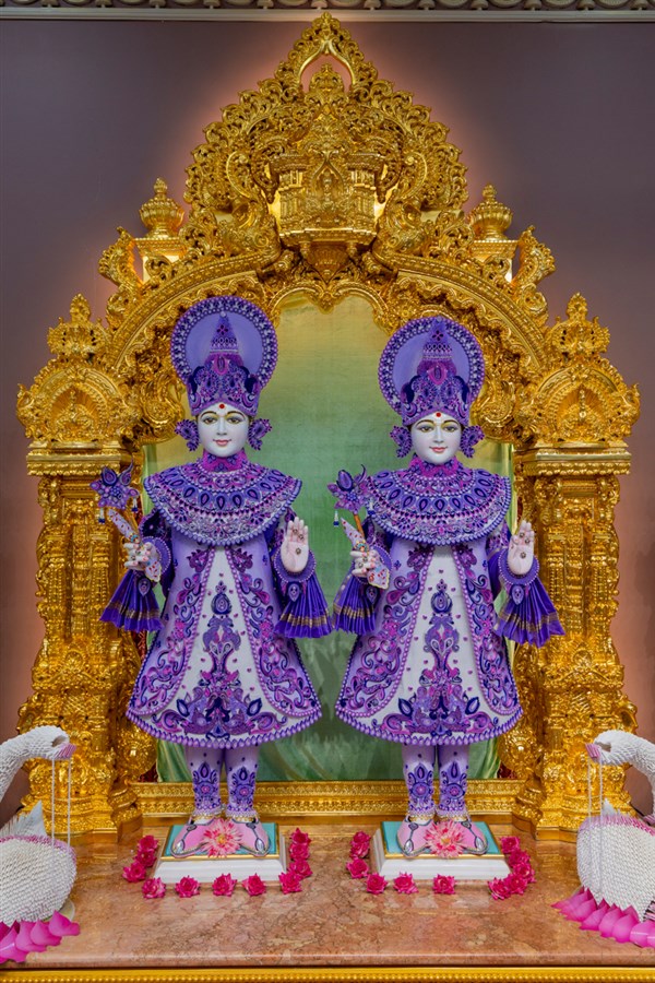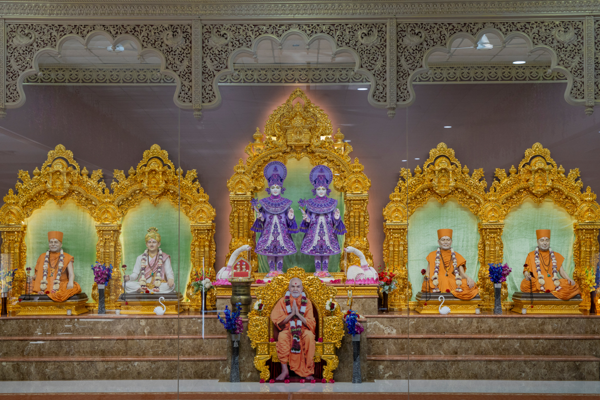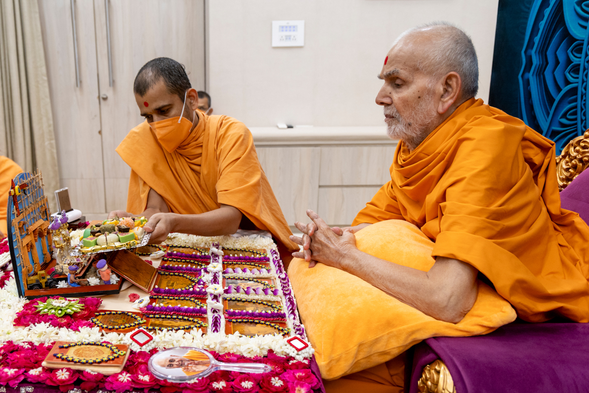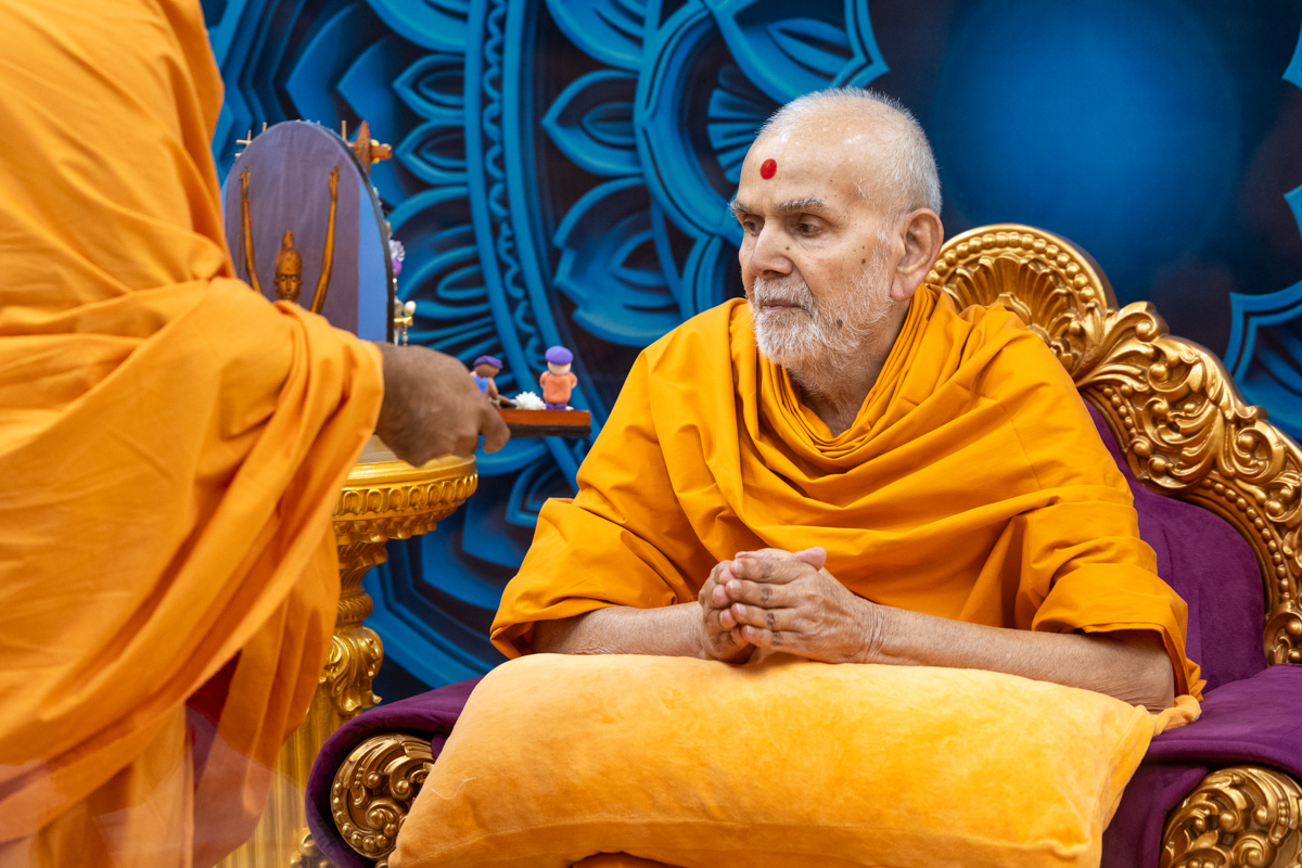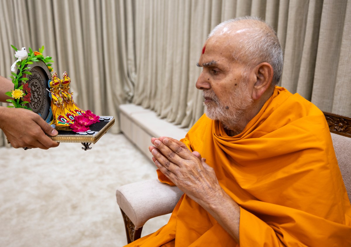 Swamishri offers thal to Shri Harikrishna Maharaj and Shri Gunatitanand Swami Maharaj