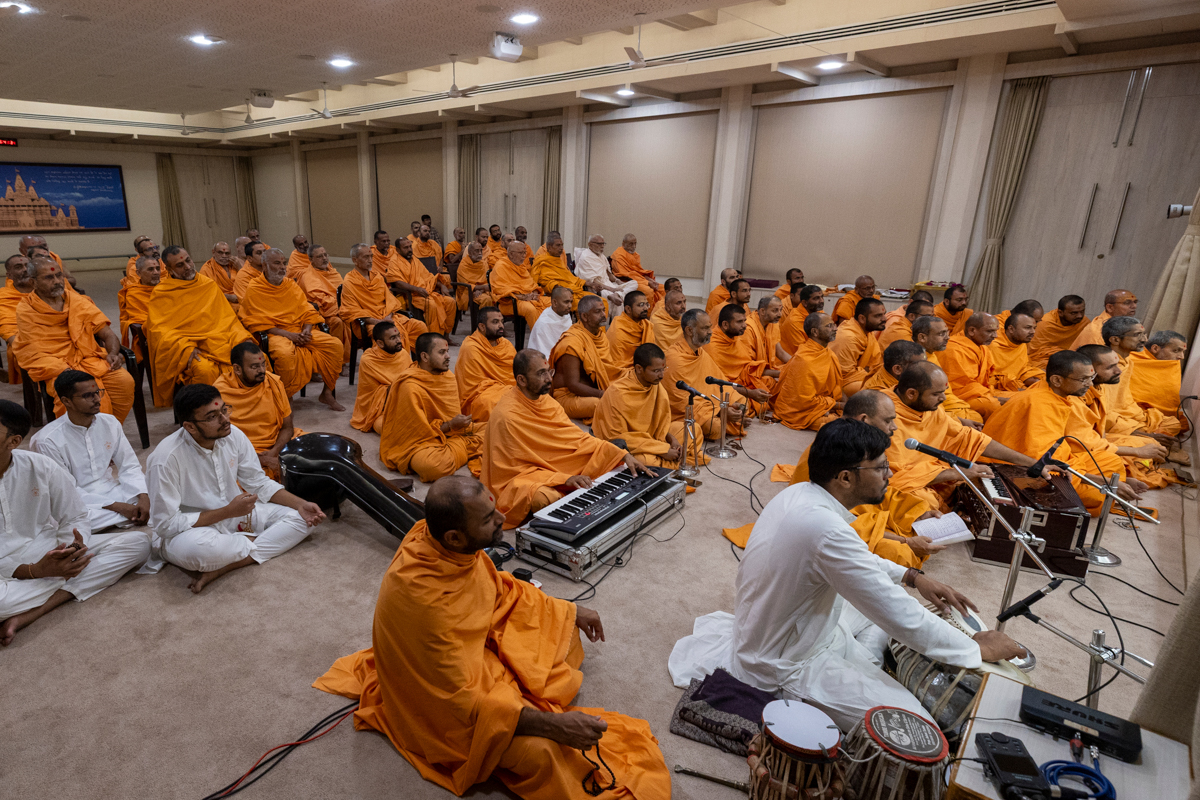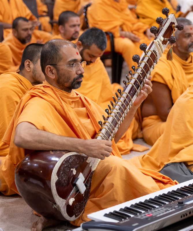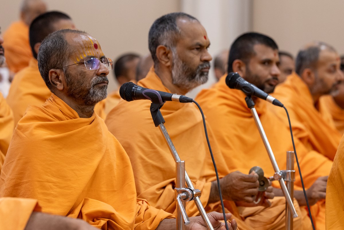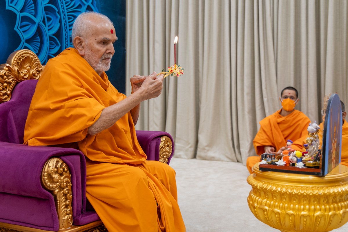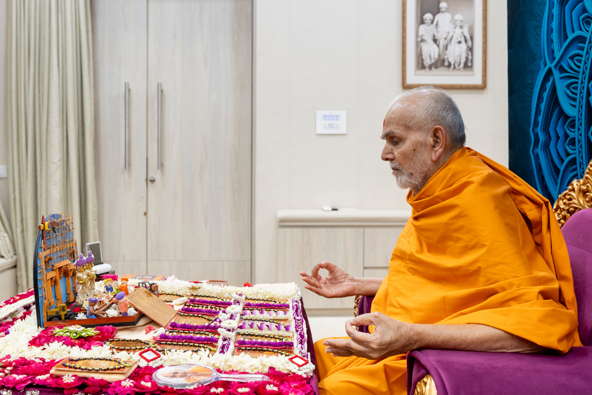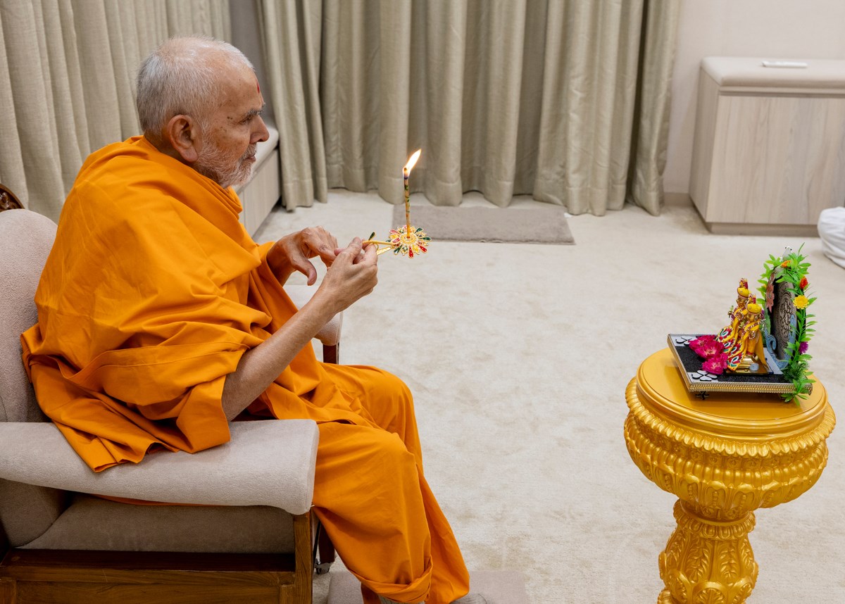 Pujya Ghanshyamcharan Swami doing Swamishri's puja darshan